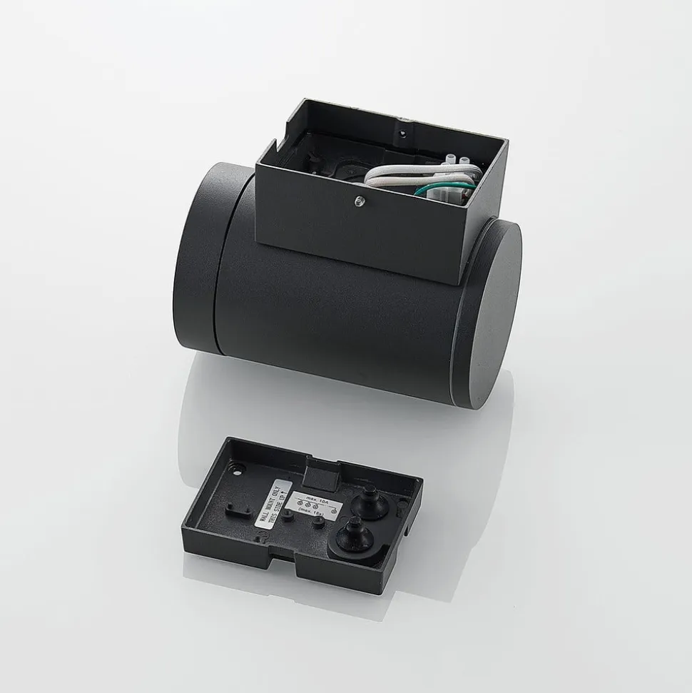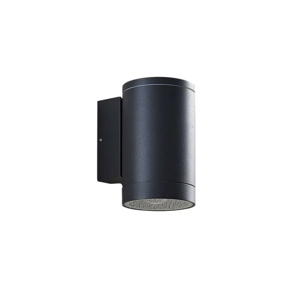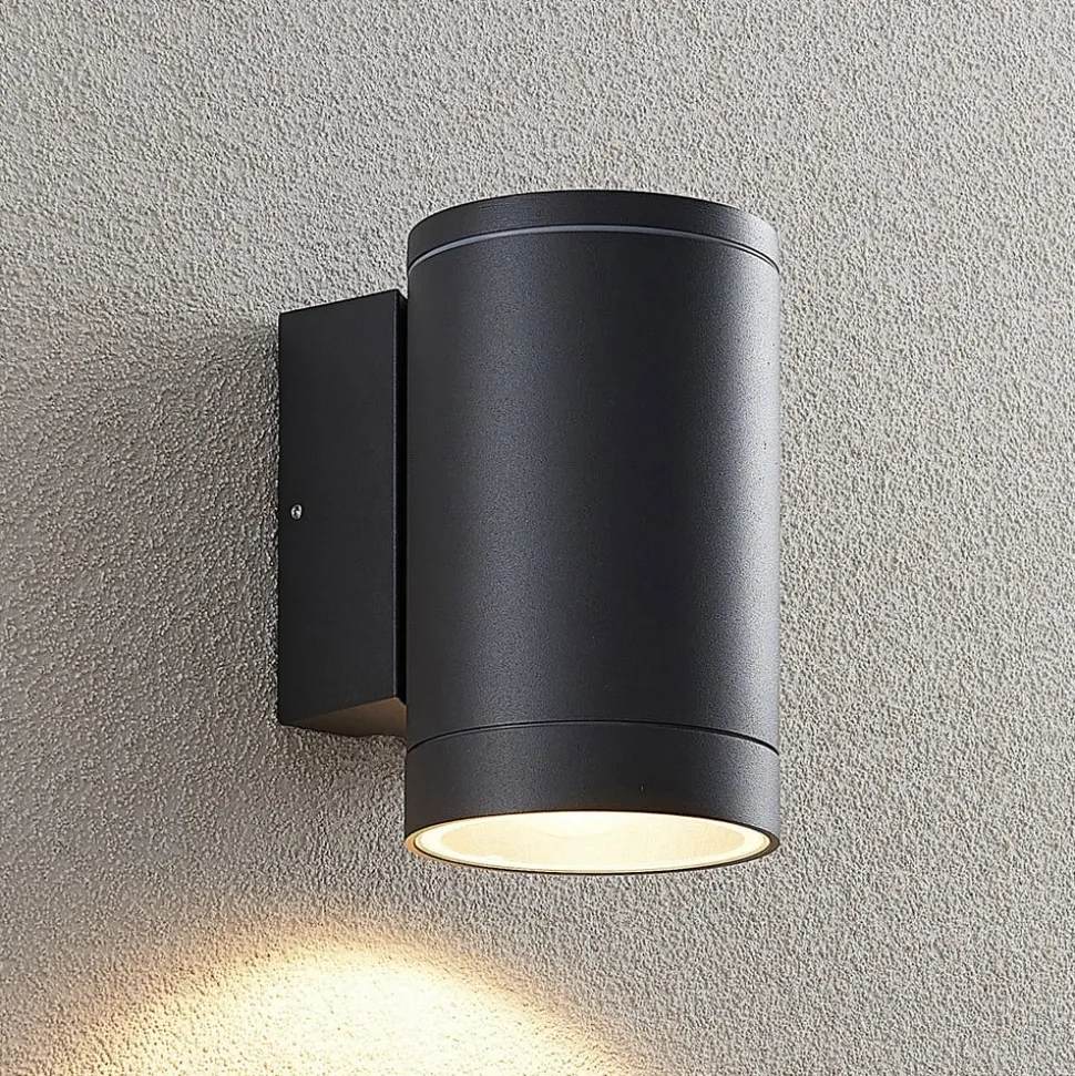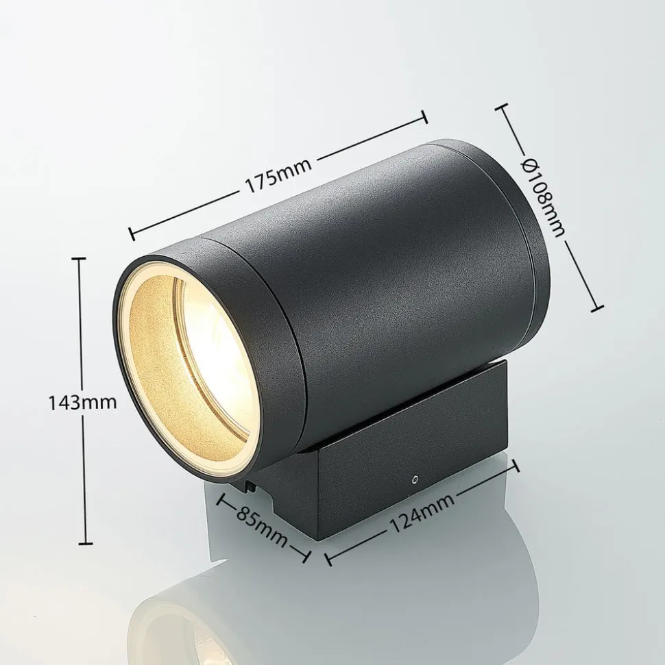 Mørkegrå udendørs væglampe Thomke med cylindrisk form Thomke kan monteres med en E27-lampe efter eget valg og giver nedadrettet lys som udendørs væglampe. Armaturhuset er lavet af aluminium og har en mørkegrå overflade, som virker meget tidløs og kan kombineres med mange miljøer. Udenfor kan Thomke installeres mange steder, hvor der er en passende strømtilslutning, f.eks. på en husfacade eller på andet murværk omkring gårdspladsen og haven.