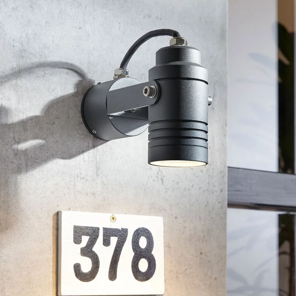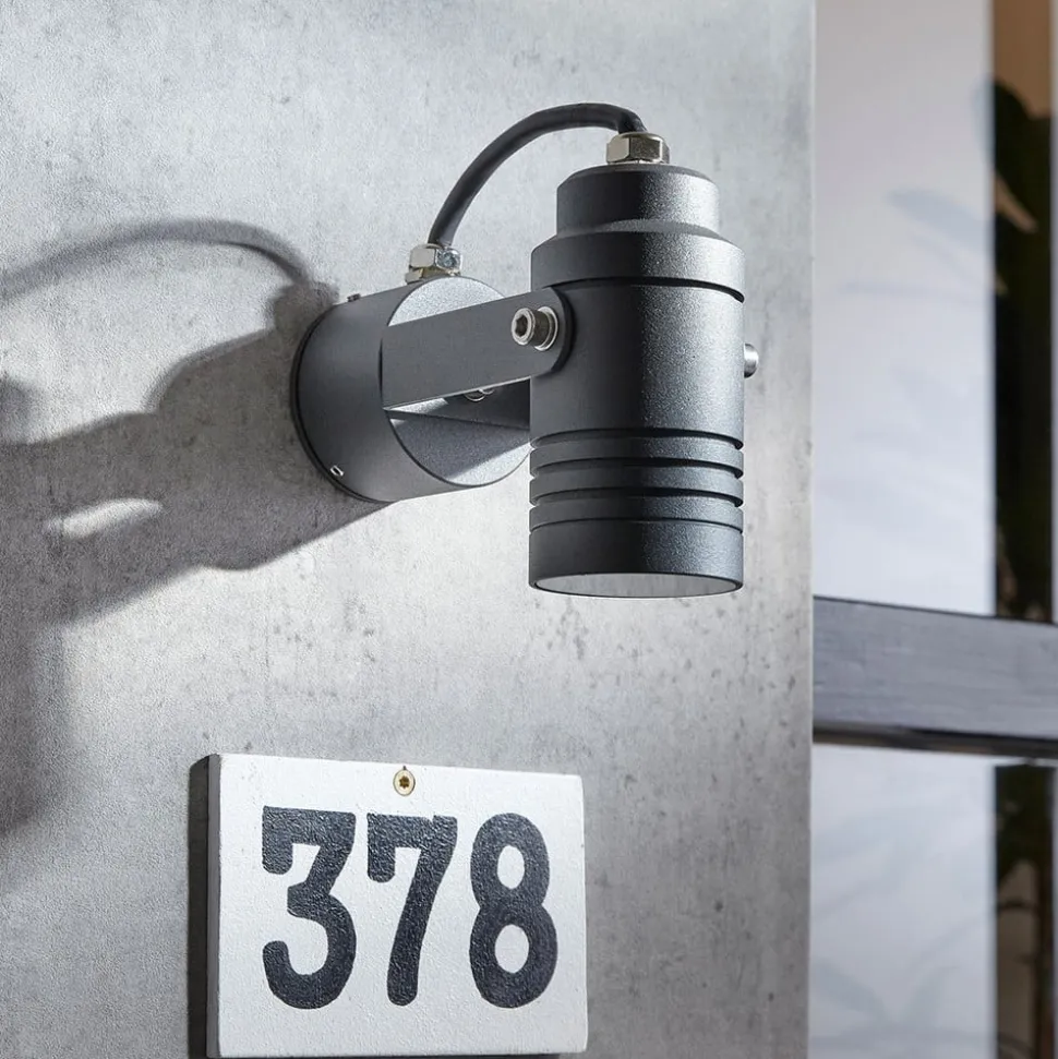 Galina drejelig udendørs vægspot i aluminium i mørkegrå Uanset om det er som jordspot, væglampe eller loftslampe – den udendørs vægspot Galina tilpasser sig særligt fleksibelt til forholdene på stedet. Armaturet imponerer også med sit moderne og alligevel klassiske design, der er baseret på et cylindrisk lampehus i mørkegrå, hvorfra to stænger forbinder lampen med beslaget. Dette er også lavet af mørkegråt trykstøbt aluminium og har ringformede fordybninger. Indkapslet i hærdet glas lyser lyskilden klart på de udvalgte områder. Den udendørs vægspot kan dæmpes eksternt, hvis der bruges en passende pære. Den kan også drejes efter behov – IK08 slagfasthed