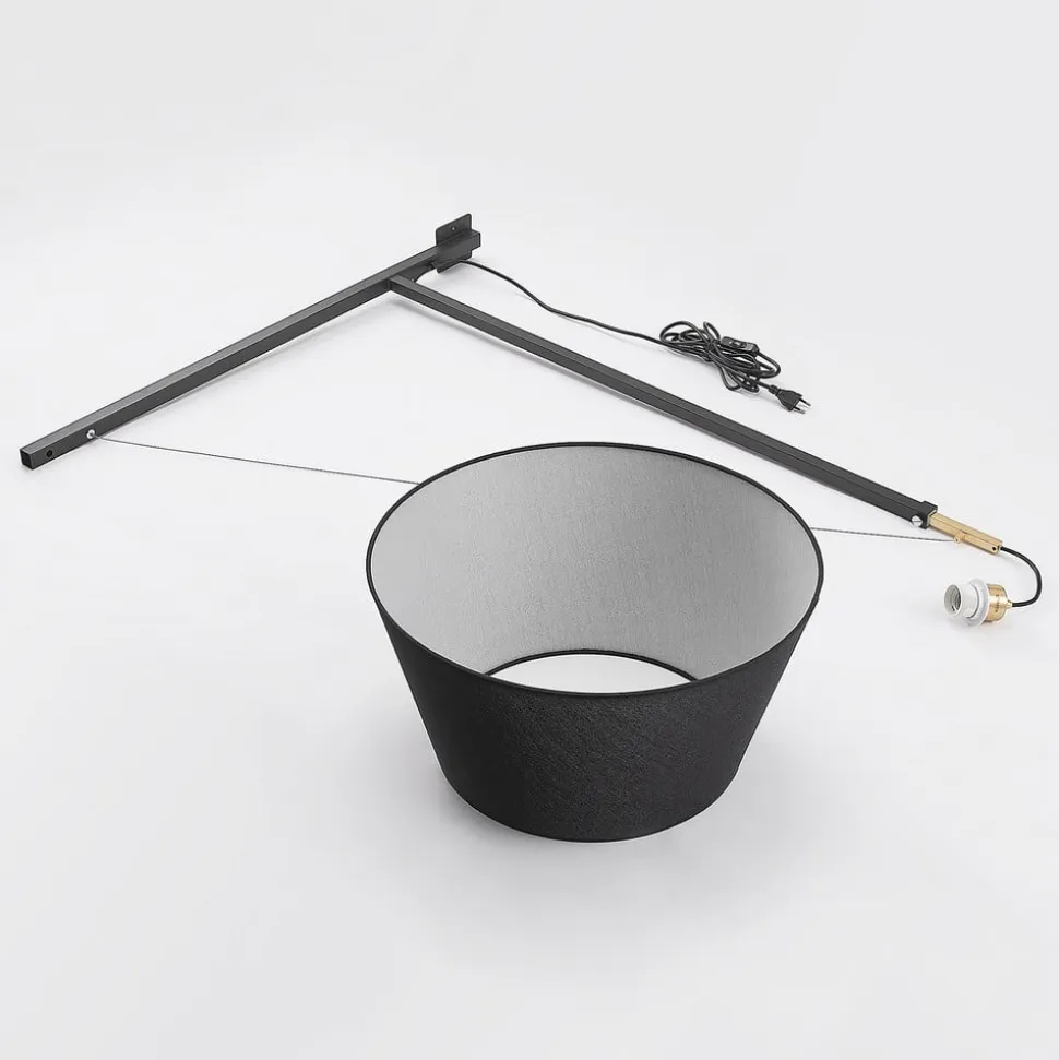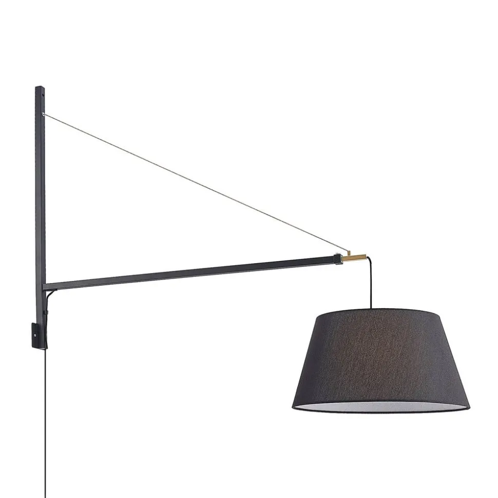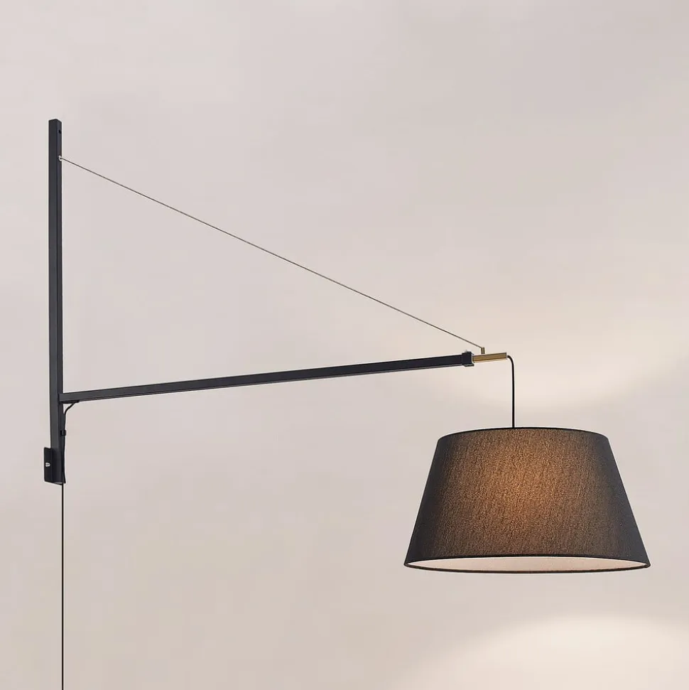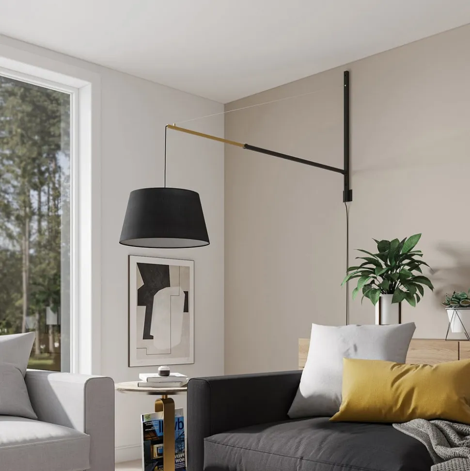 Udtrækkelig Beleza væglampe med sort stofskærm Beleza imponerer med et moderne touch og et usædvanligt design, da den ser ud til at være et tænkeligt alternativ til en hængelampe. Her hænger den sorte skærm dog ikke ned fra loftet, men strækker sig ud i rummet via et vægbeslag, hvis fremspring kan justeres. Beslagets sorte og gyldne farver giver en effektfuld kontrast, og udspringet kan justeres fra 136 cm til 218 cm, hvilket sikrer en vis fleksibilitet. Et seværdigt belysningsarmatur til moderne interiør!