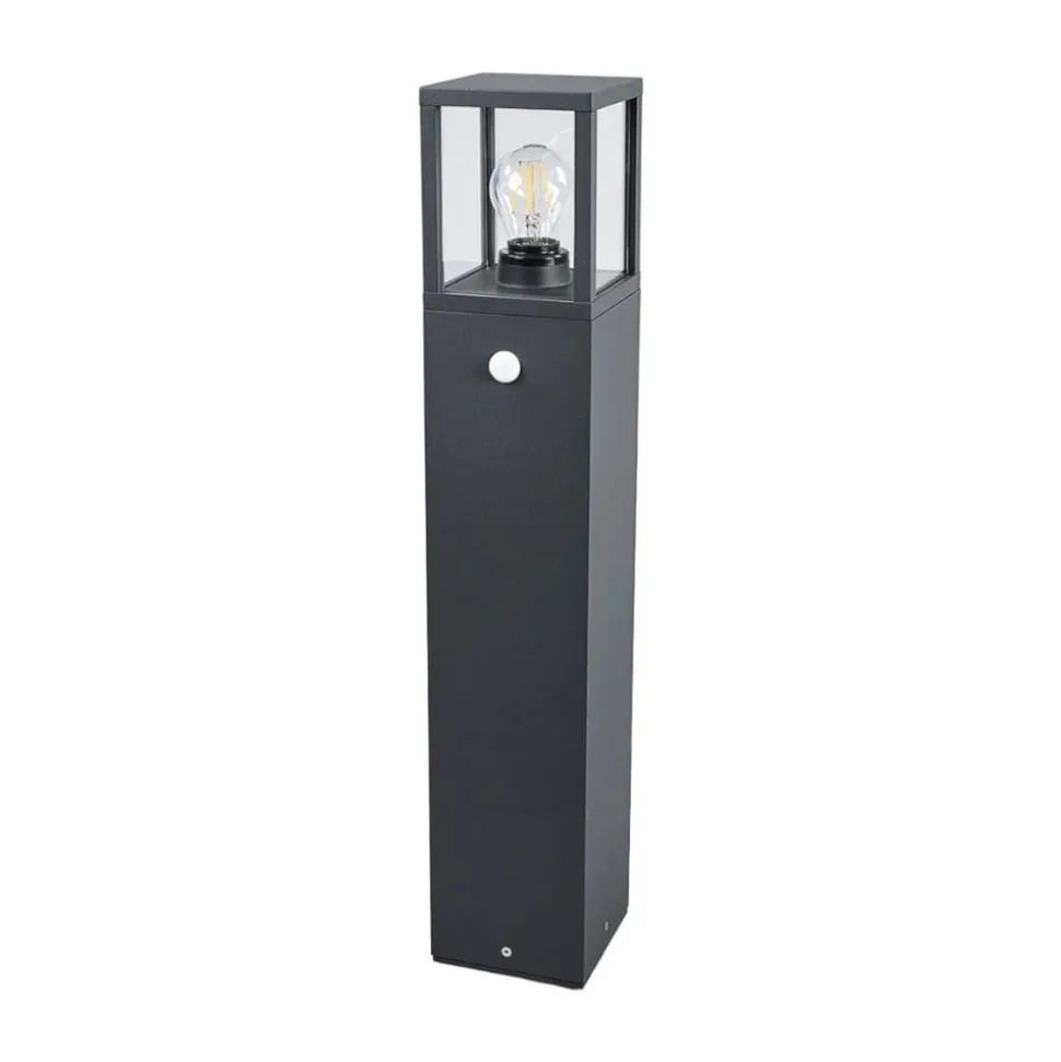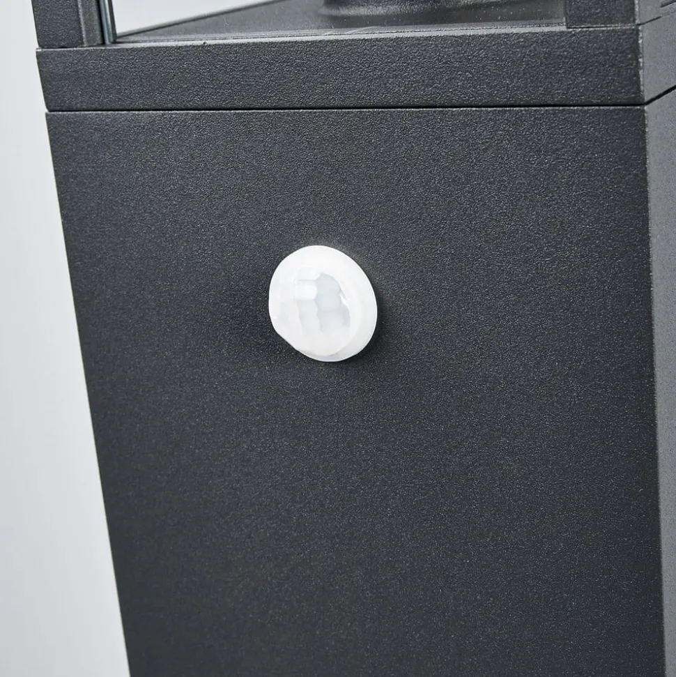 Grafitgrå Klemens vejlampe med nyttig sensor til registrering af bevægelse Klemens har et meget moderne udseende med sin kantede form og er derfor ideel til installation i omgivelserne i moderne bygninger. Klare glasindsatser på alle sider af den øverste sektion giver et direkte udsyn til pæren og forringer dermed ikke lysstyrken. Det faktum, at vejlampen har en integreret sensor, viser sig at være meget praktisk, for så snart en person nærmer sig lyset, reagerer den ved at tænde, så man straks har lys nok til at orientere sig. Sensordata: – Registreringsvinkel 180° – Rækkevidde 8 m – Lysvarighed justerbar: 5s – 30 s – 1 min – 3 min – 5 min – 8 min