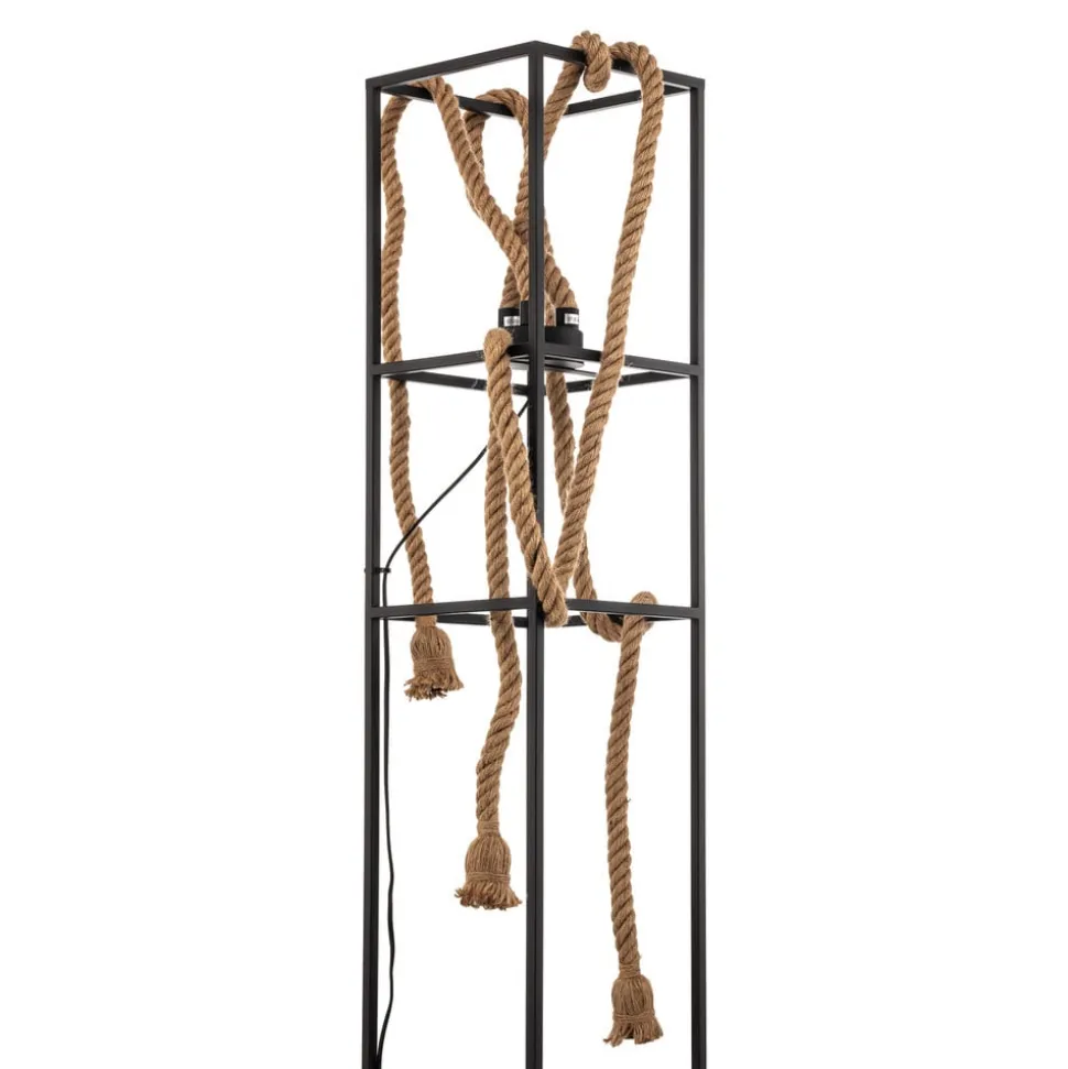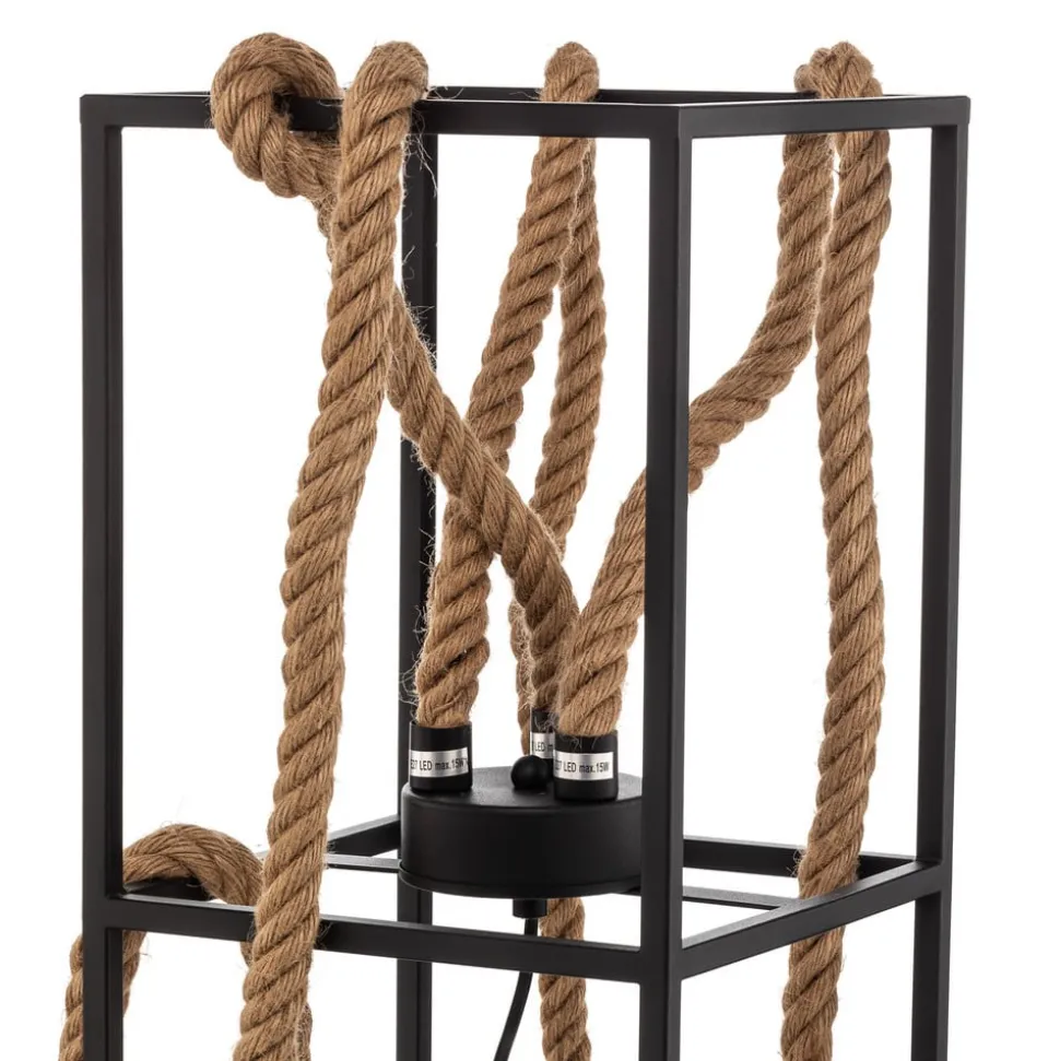Kantet, rammeformet Vlados gulvlampe af jern med tre hampetove Vlados-gulvlampen skiller sig uden tvivl ud i stuen med sit usædvanlige og unikke design. Den består af en slags bur eller ramme lavet af sort stål og orienteret lodret. Hampereb er fastgjort fra stikkontakten til fatningerne, hvilket skaber en slående kontrast til metalrammen med dens sorte overflade. De kan vikles rundt om rammen efter ønske, hvilket naturligvis også giver mulighed for at skabe et mere individuelt look. Selve pærerne spiller også en vigtig rolle for udseendet og bør derfor vælges, så de matcher og helst har en glaskolbe, som det er tilfældet med klassiske glødepærer, der i dag i vid udstrækning erstattes af LED-pærer, fordi de ligner, men er meget mere effektive.