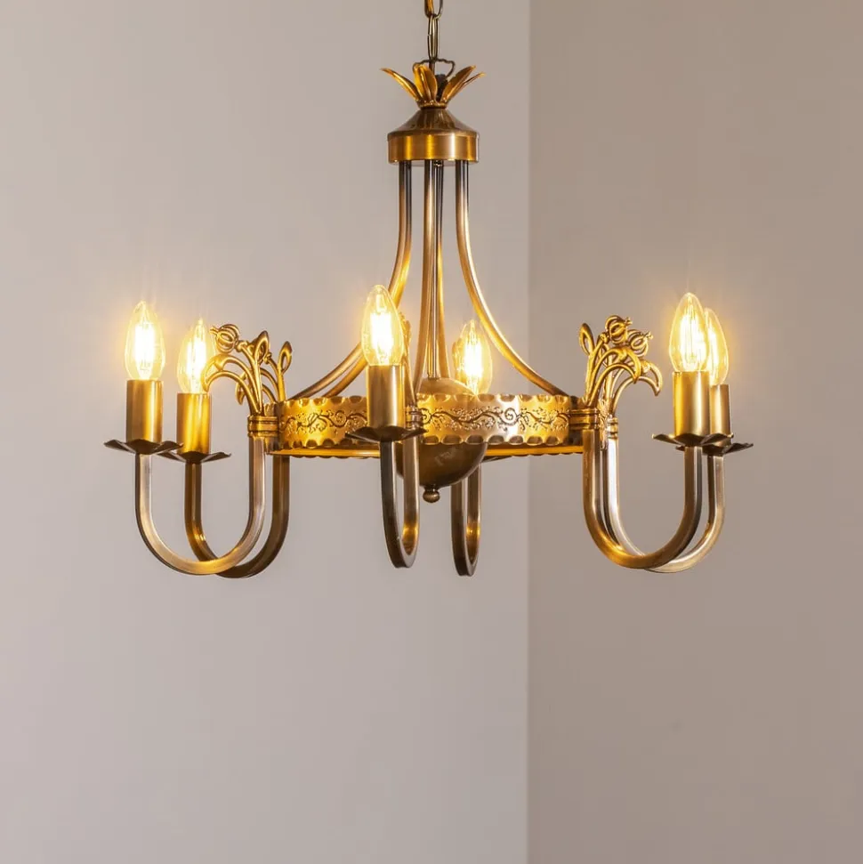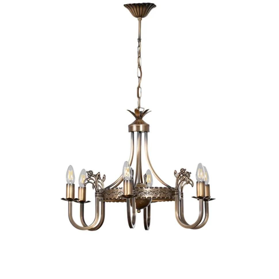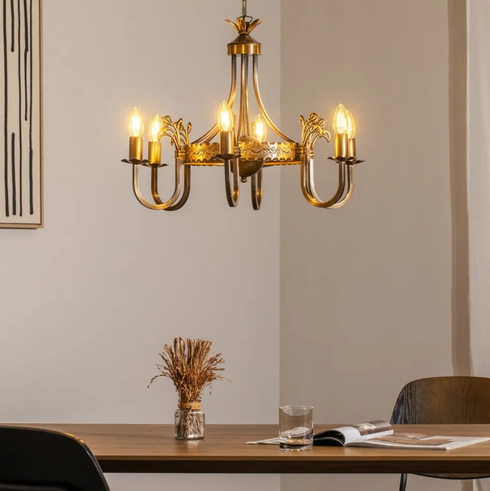 Lysekrone Castle lys patineret med 6 lyskilder forener antik charme med moderne funktionalitet. Fremstillet af højkvalitets metal og med en elegant lys patineret messingfinish passer denne lysekrone perfekt ind i stuen og spisestuen. De seks pærer sikrer en jævn og imponerende lysfordeling, der bader ethvert rum i en stilfuld atmosfære.