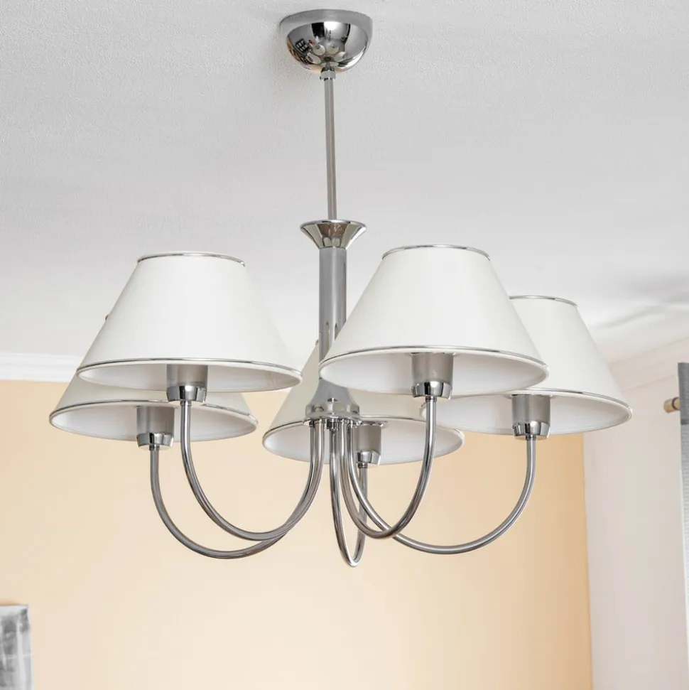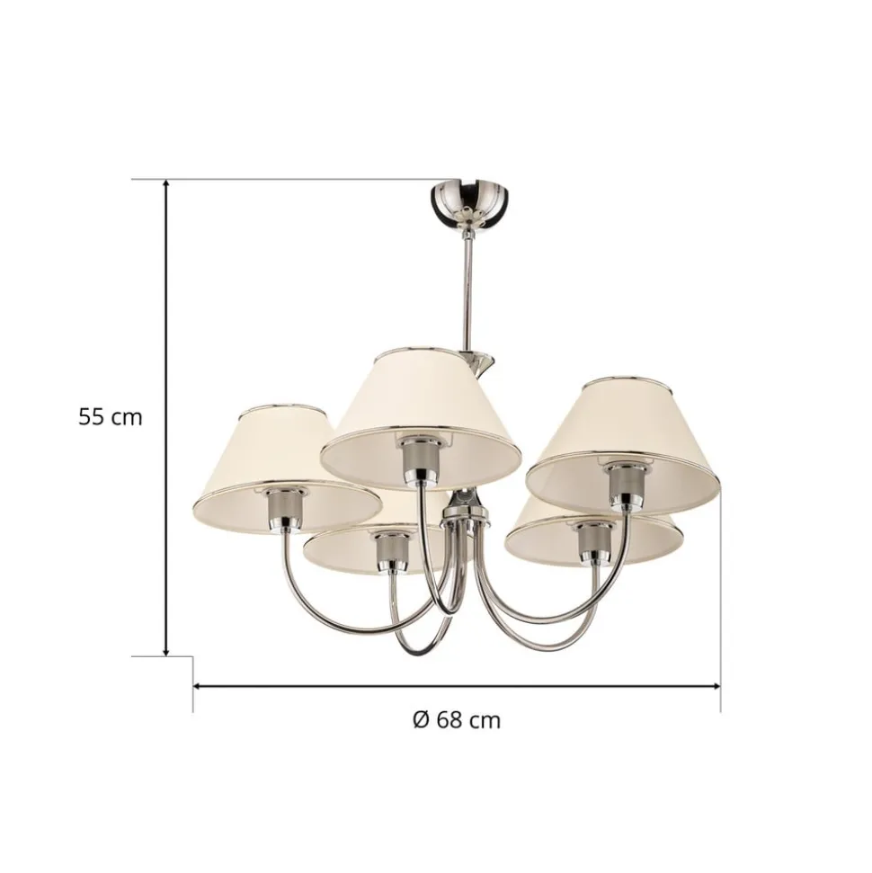 Lysekrone London forener tidløs elegance med moderne alsidighed og bliver dermed et højdepunkt i enhver stue eller spisestue. Den er fremstillet af højkvalitets metal og PVC-plast og stråler i en tiltalende krom og cremefarve. Konstruktionen med 5 lyskilder sikrer en jævn og behagelig belysning, der bader rummet i en varm og indbydende atmosfære.