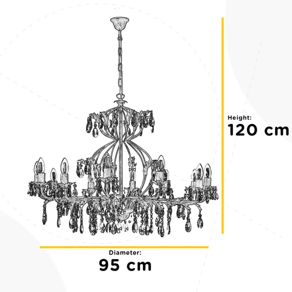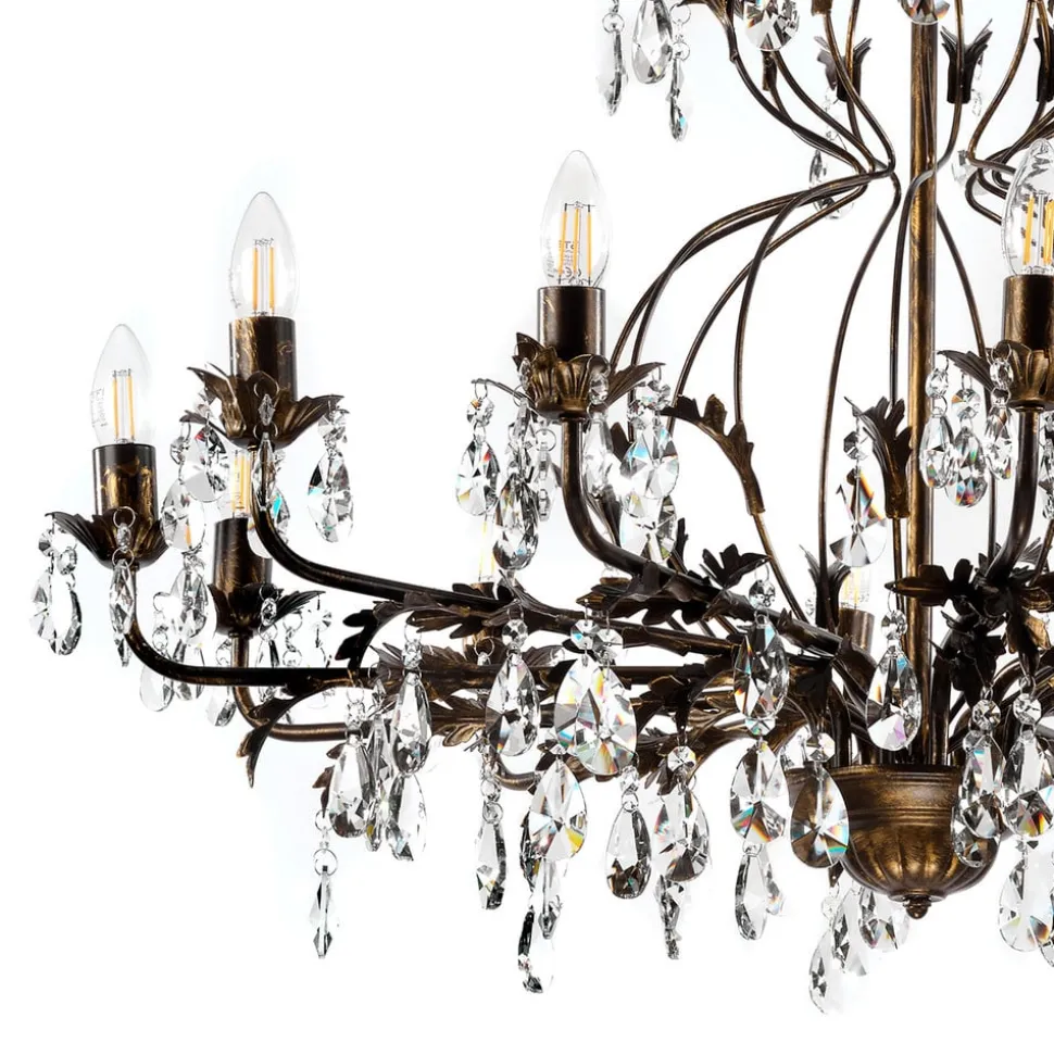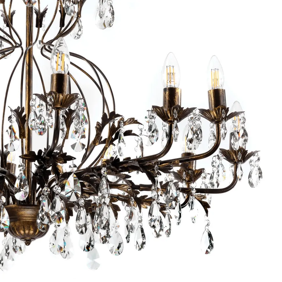Lysekrone Teresa imponerer med sin antikke stil og bronzefarvede overflade, der giver ethvert rum et luksuriøst præg. Med sine 12 flammer skaber den en imponerende lysscenografi, der skaber en stemningsfuld atmosfære i både spisestuen og stuen. Kombinationen af metal og krystal giver lysekronen ikke kun en robust struktur, men også en fascinerende lysbrydning, der dypper rummet i en funklende atmosfære.
