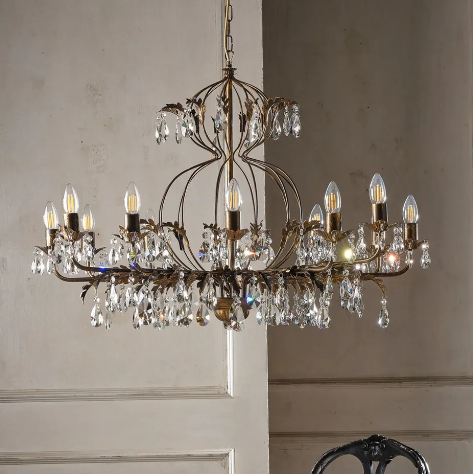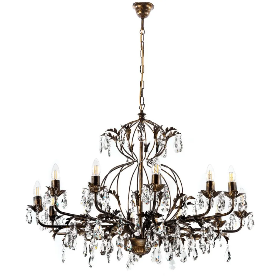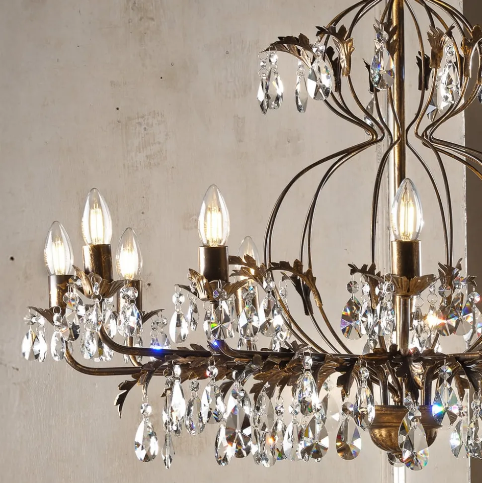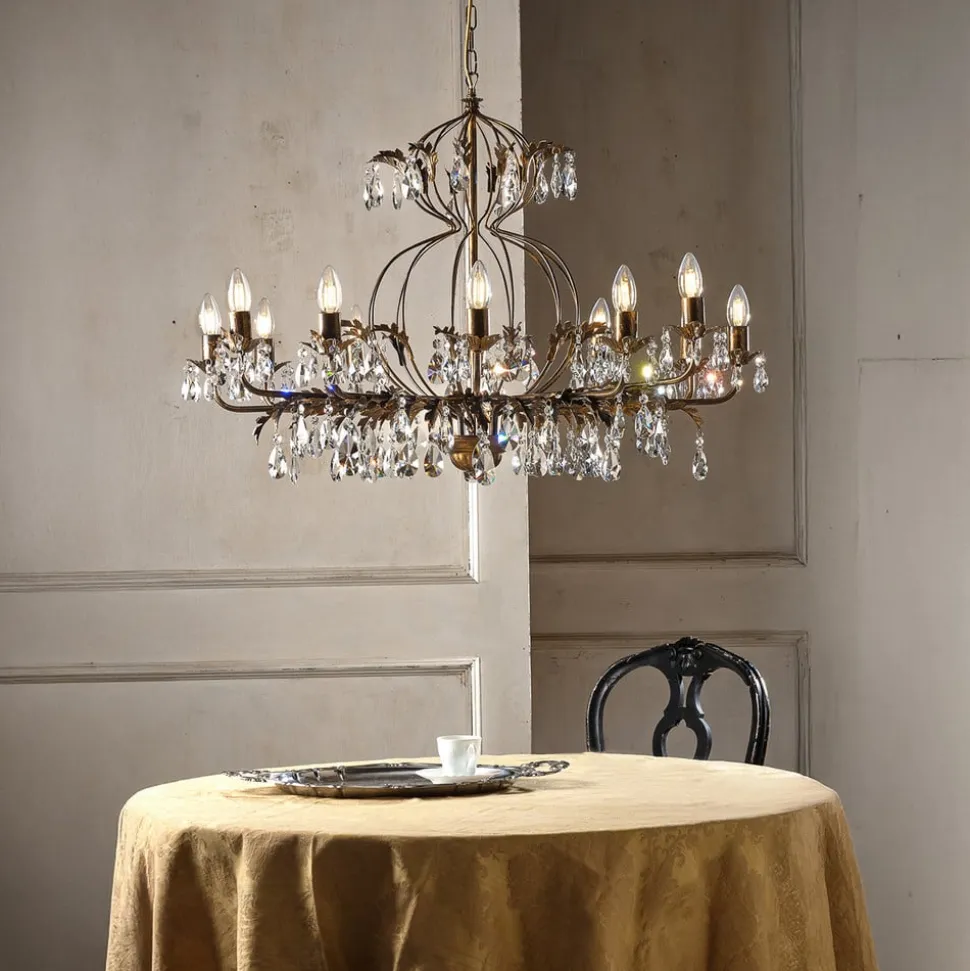 Lysekrone Teresa imponerer med sin antikke stil og bronzefarvede overflade, der giver ethvert rum et luksuriøst præg. Med sine 12 flammer skaber den en imponerende lysscenografi, der skaber en stemningsfuld atmosfære i både spisestuen og stuen. Kombinationen af metal og krystal giver lysekronen ikke kun en robust struktur, men også en fascinerende lysbrydning, der dypper rummet i en funklende atmosfære.