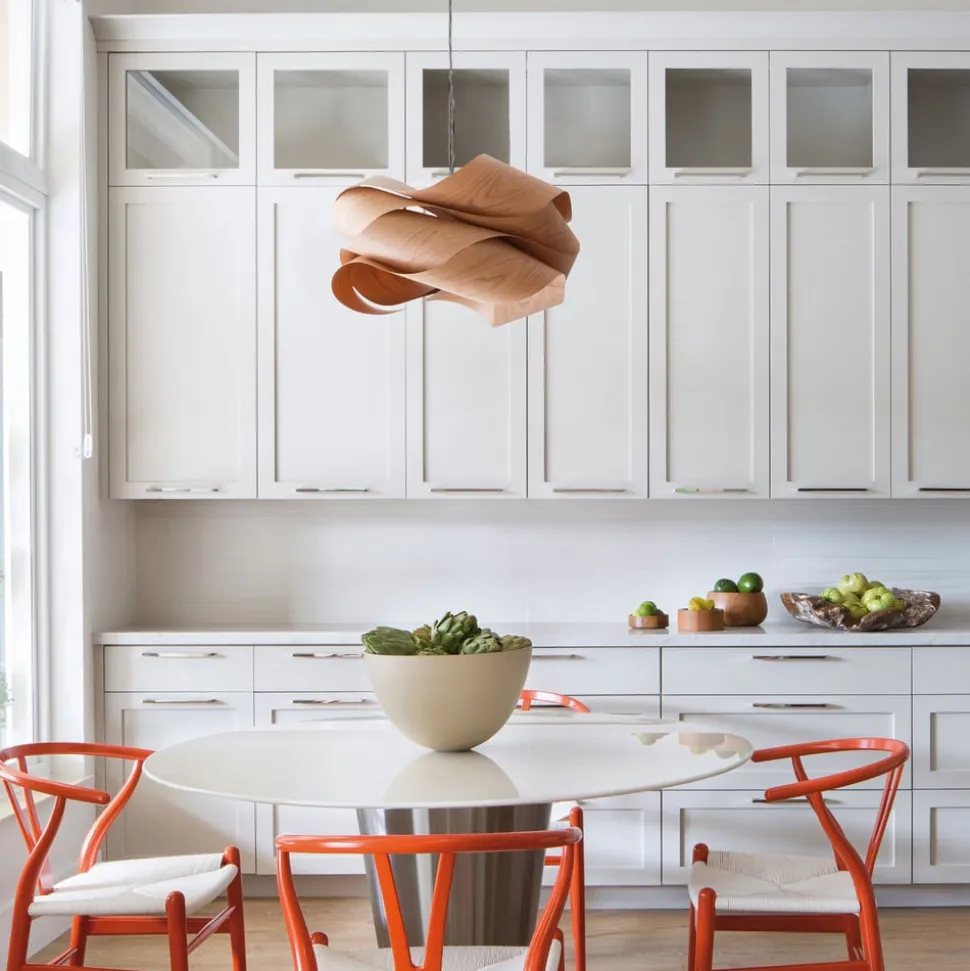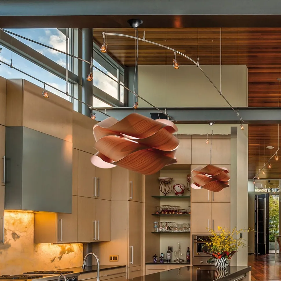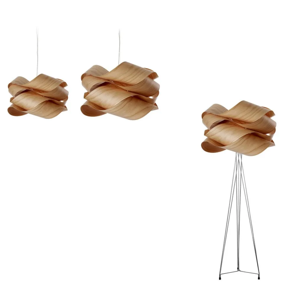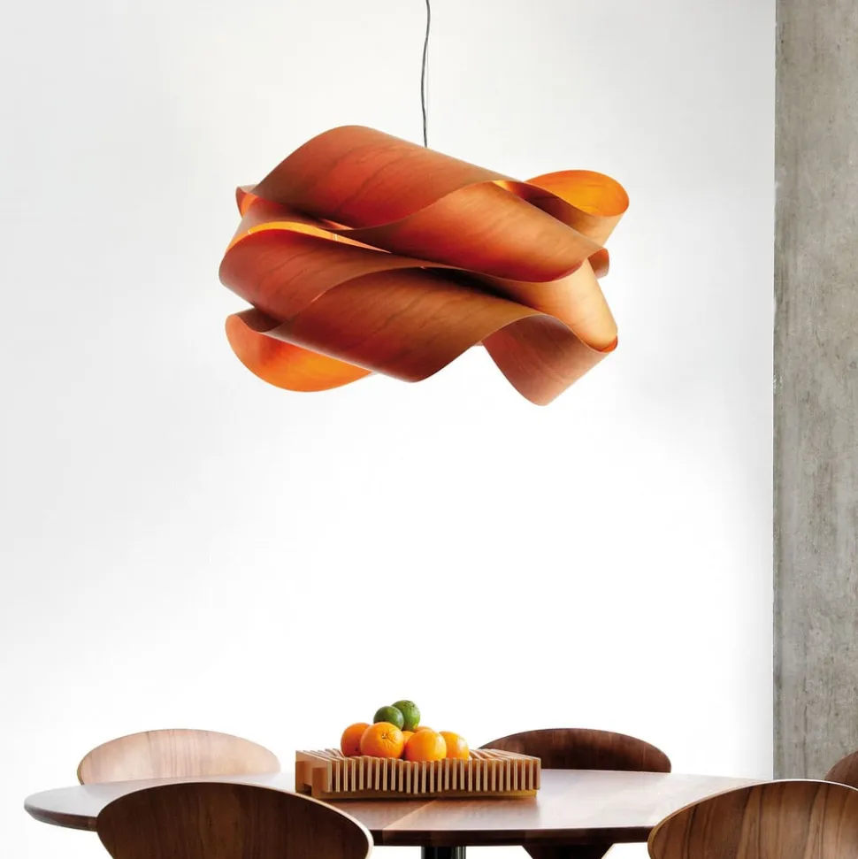 Link pendellampen ligner flere bølger, der løber over hinanden. Den organiske svingning og træfinerets årer, som er endnu mere synlige, når den er tændt, gør pendellampen til et absolut blikfang af naturlig skønhed. Lyskilden er skjult inde i skærmen, og dens lys skaber en komposition af skygge og lysstyrke med de gennemsigtige finerbånd. Med det dygtige samspil mellem behagelig lyseffekt og naturlighed skaber Link en varm og hyggelig atmosfære i private opholdsrum og i offentlige stuer.