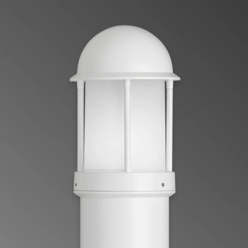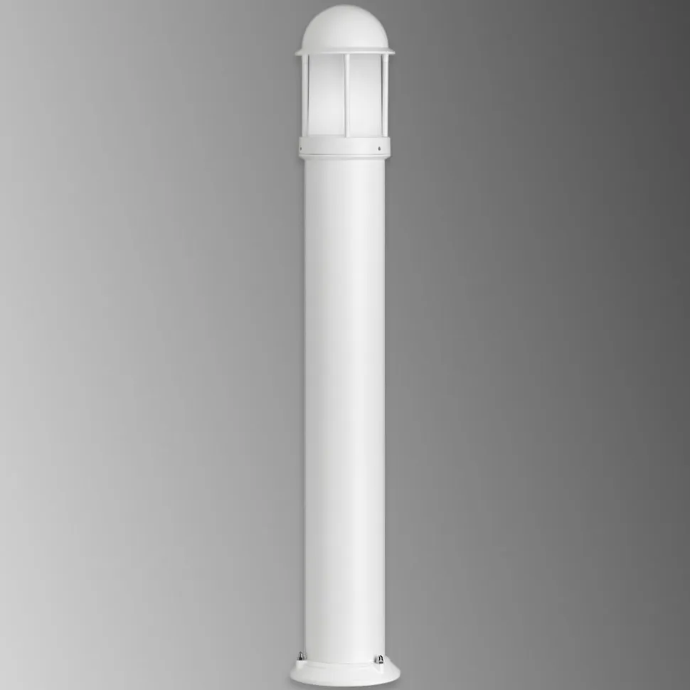 Afrundet Marco vejlampe af aluminium Den stolpeformede Marco vejlampe med afrundet hoved har et tidløst moderne og lidt maritimt look. Den opalhvide polykarbonatskærm lader lyset slippe ud i alle retninger, mens hovedet sikrer blændfri belysning. Basen og hoveddækslet på den kapslingsgraderede vejlampe er lavet af trykstøbt aluminium og er absolut holdbare.