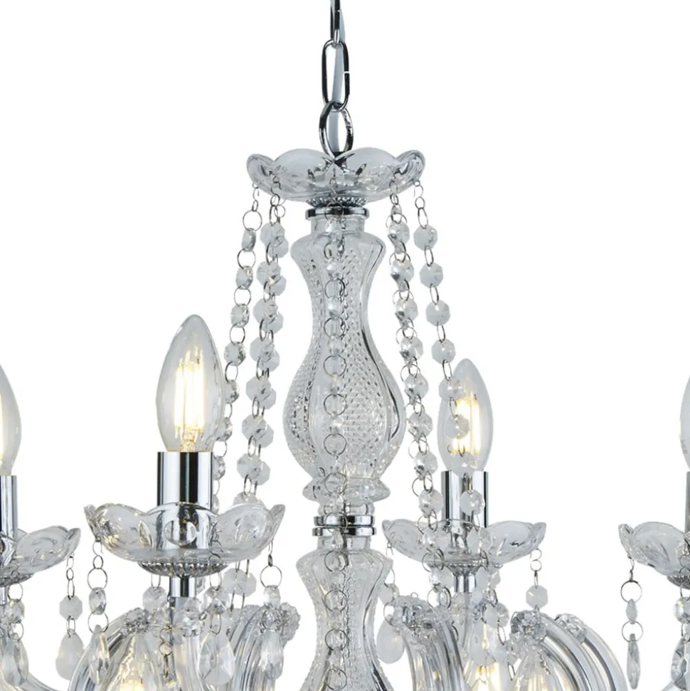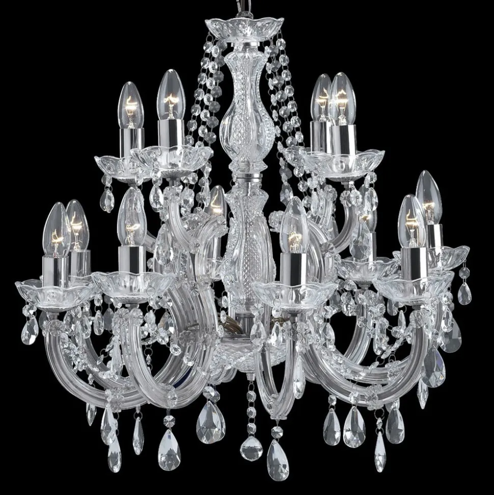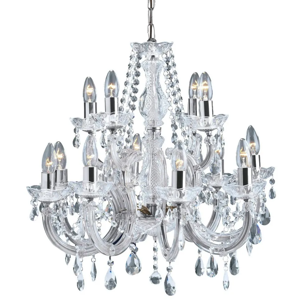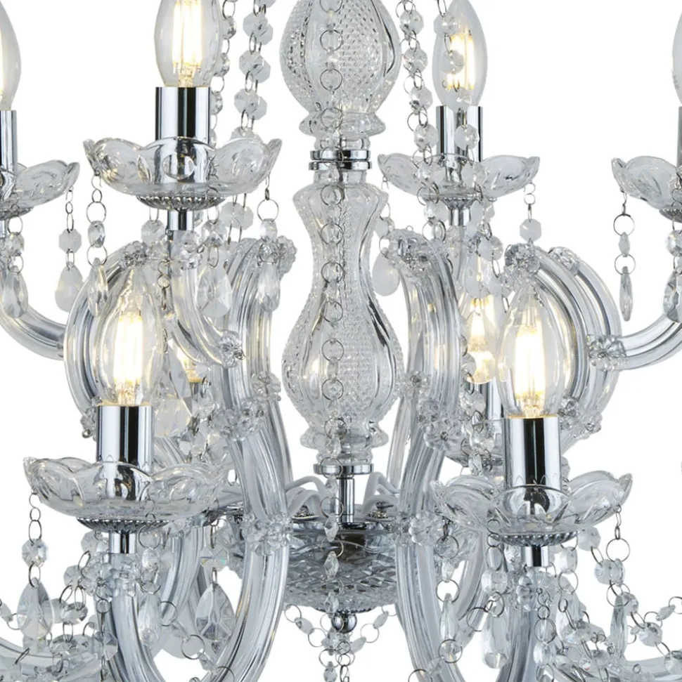 MARIE THERESE lysekronen fremstår helt i klassisk forklædning. De mange detaljer af slebne glaskrystaller pryder lysekronen og hænger dekorativt ned fra de elegant svungne arme af akrylglas. Metalelementerne i skinnende krom runder helhedsbilledet stilfuldt af. En elegant lysekrone til glansfulde momenter.