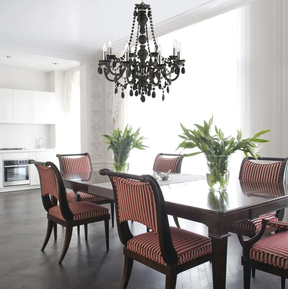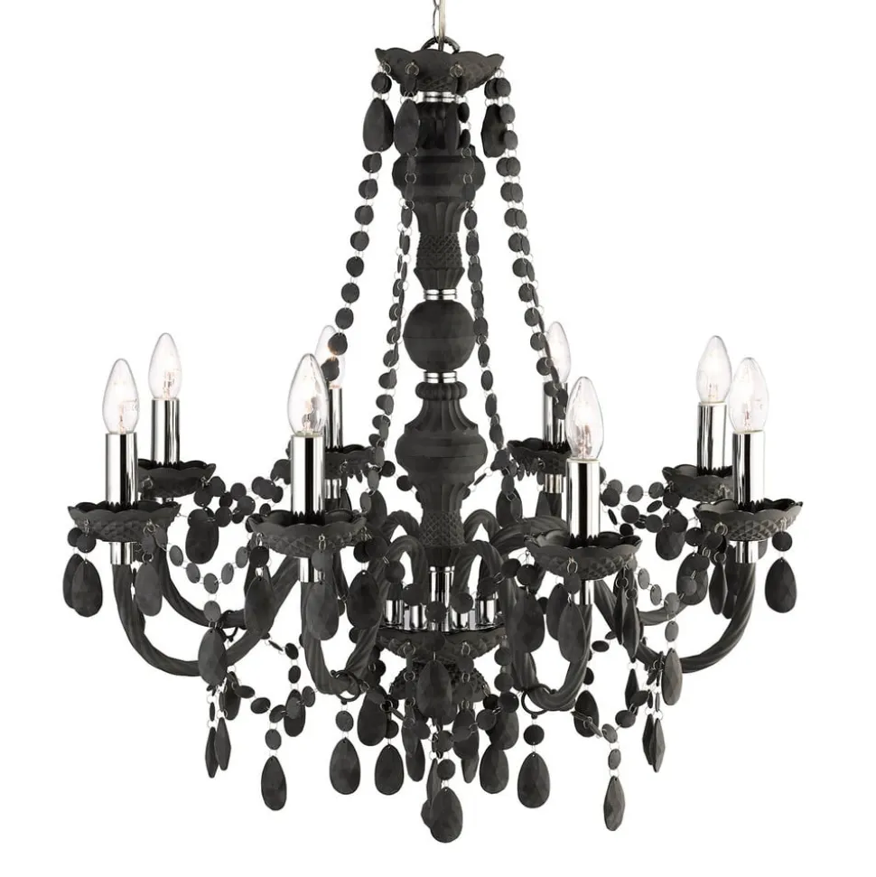 I det usædvanlige en lysekrone farve mørkegrå med en mat finish, præsenterede de meget klassisk designede lysekrone. Disse modsætninger gør Marie Therese lysekrone til et slående udseende, der bliver midten af rummet. Monteret over et bord giver den smuk generel belysning, der også er tilstrækkelig til større rum takket være lyskilderne (medfølger ikke), der sidder frit i lysakslerne. Marie Therese lysekrone ser lige så strålende ud i en stor gang eller indgang. De mange gardiner i form af dråber, flade og runde elementer lavet af akryl, hvoraf nogle blev spændt i kæder, pryder også den otte-armede lysekrone .