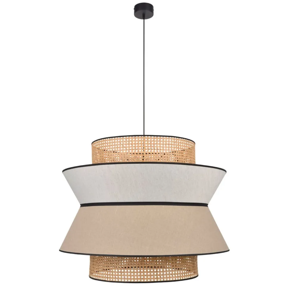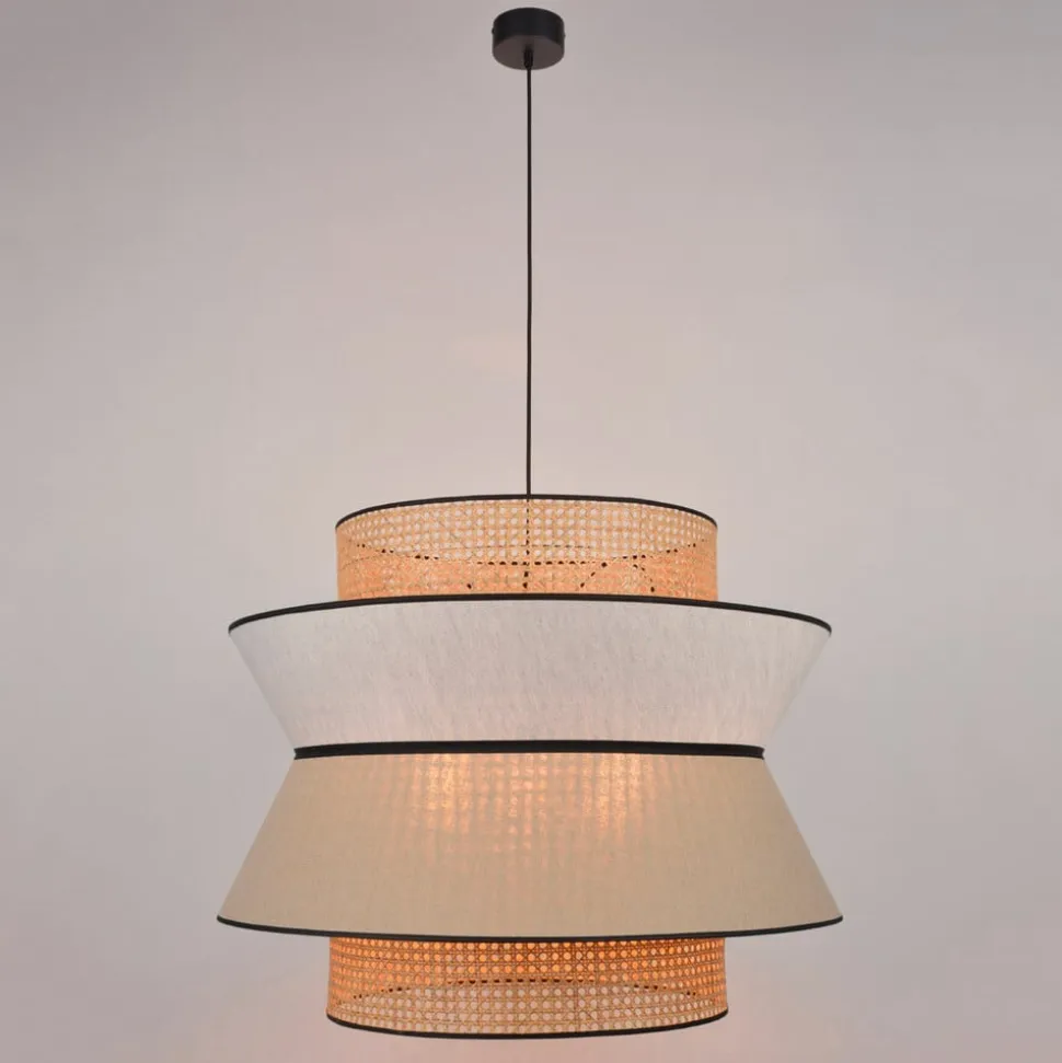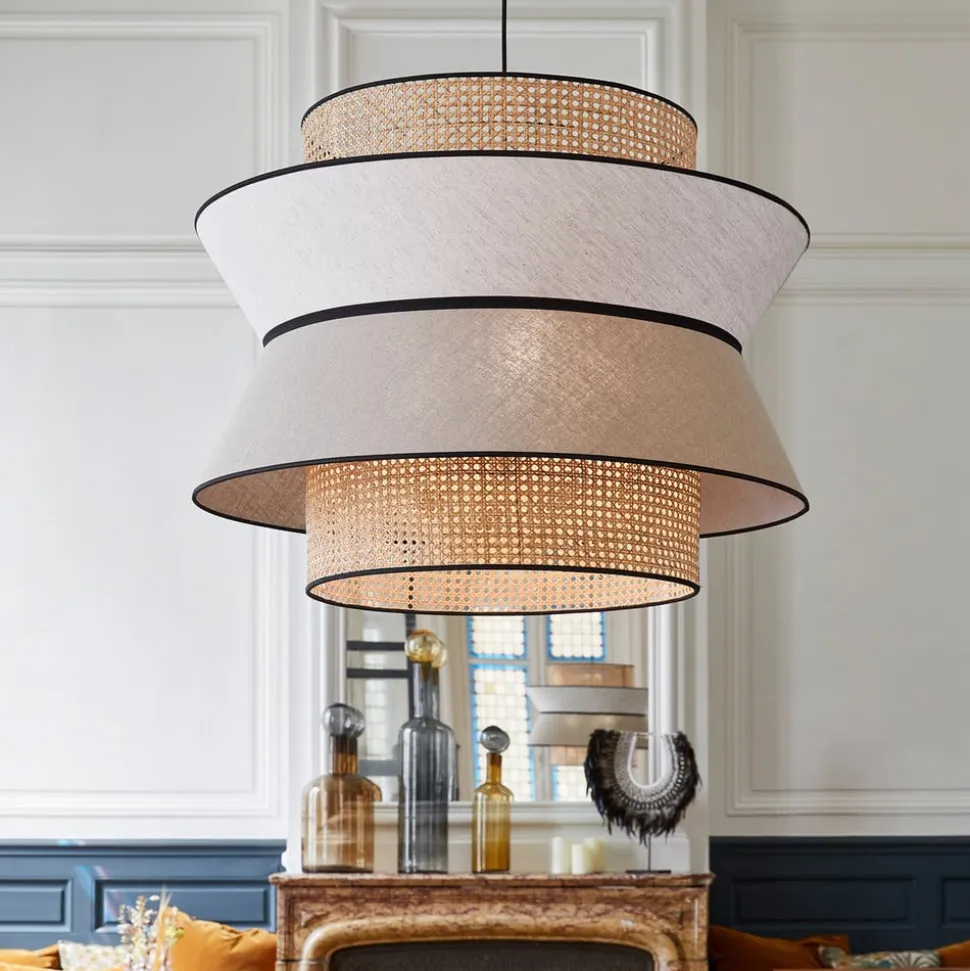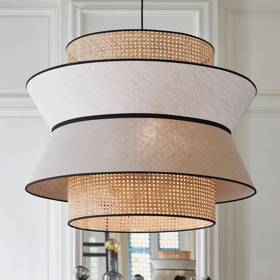 Hængelampe Singapour XXL til store rum Med sit iøjnefaldende design med tre skærme og sin størrelse er hængelampen Singapour XXL ideel til at belyse større borde og områder. Dens look har en naturlig effekt og passer til mange moderne indretningsstile. Under stofskærmen af vasket hør, som består af to dele i forskellige farver, er der fastgjort en anden skærm i konisk form, som er lavet af rattanvævning. Når lyset udsendes, skiller denne skærm sig markant ud under hørskærmen, da rattanmønsteret er synligt under stoffet. Resultatet er en lysfyldt atmosfære med en særlig karakter, der skaber en hyggelig stemning. Udstyret med tekstilkabel – eksternt dæmpbar Designet af Singapour-lampeserien kommer fra MARKET SET, et ungt designteam fra belysningsfirmaet Corep SAS fra Bègles i Frankrig, som skaber luksuriøse lampekollektioner til en overkommelig pris.