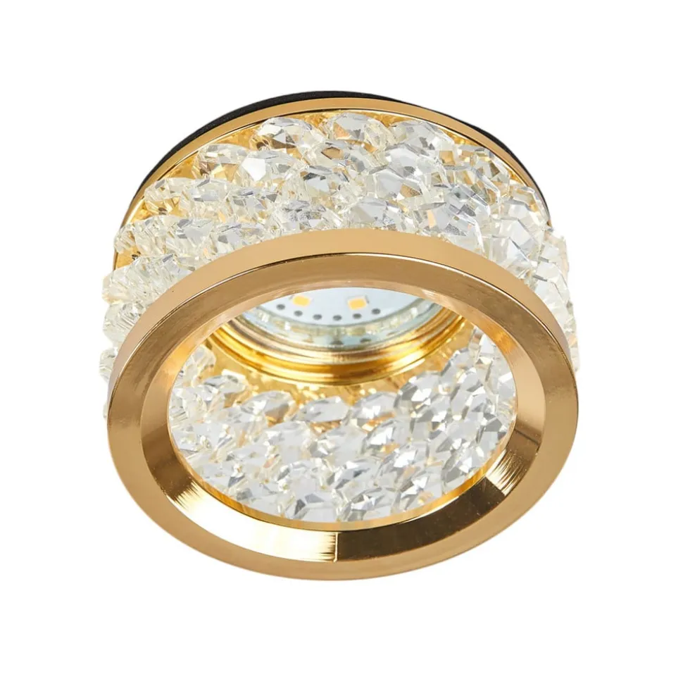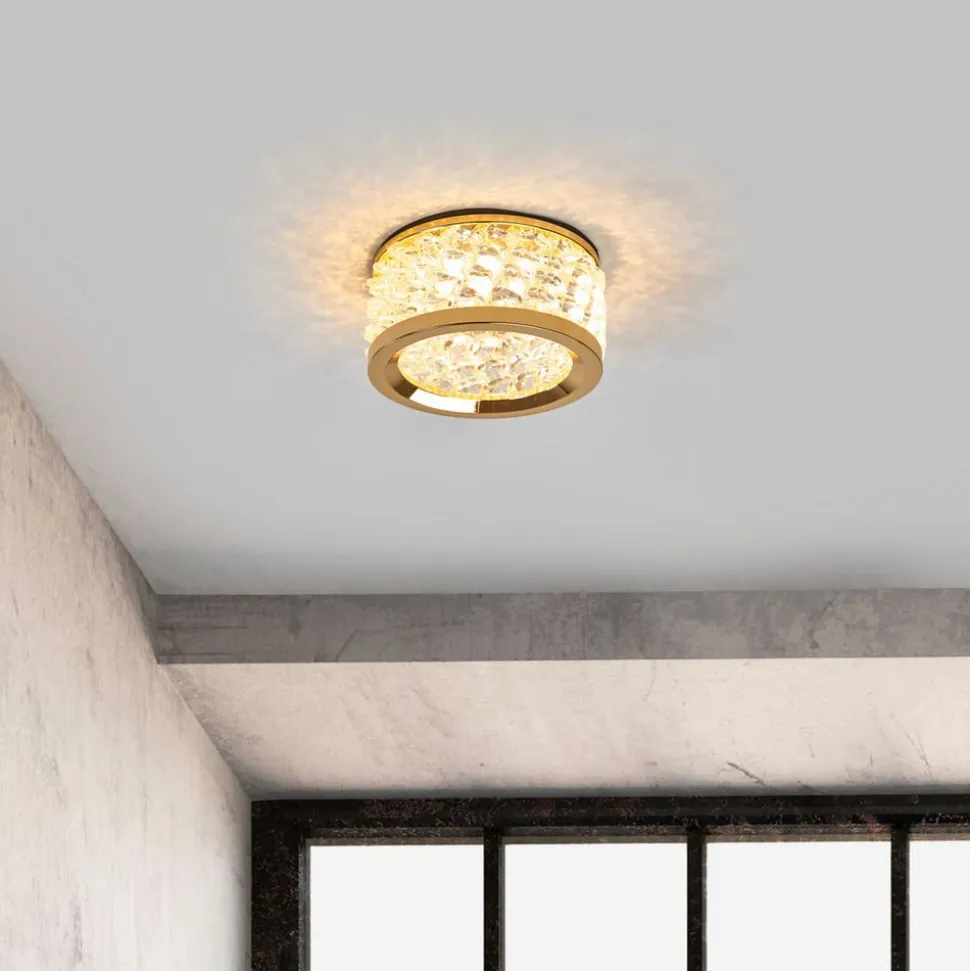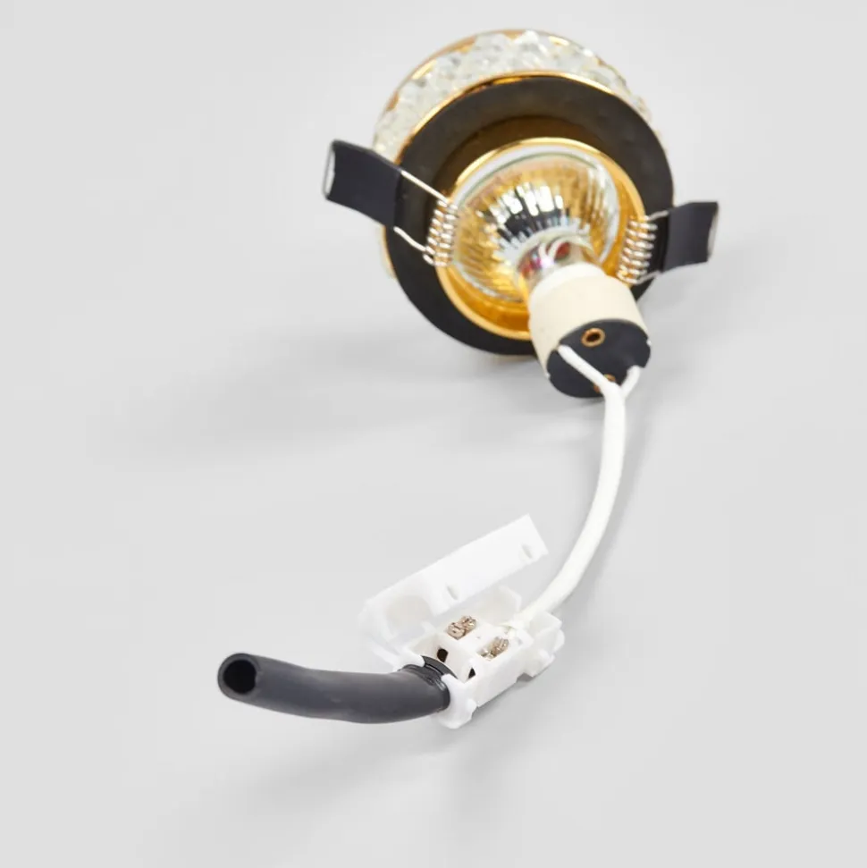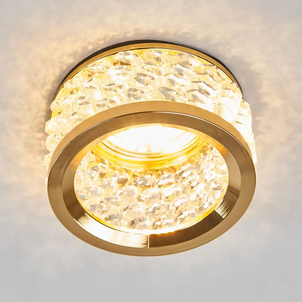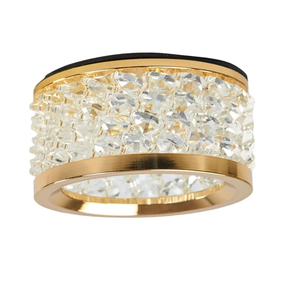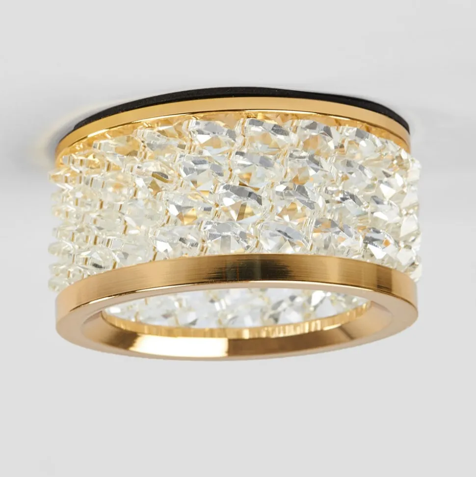 Den krystalbesatte indbygningslampe Iwen forbinder glamour med funktionalitet. Små krystalperler og smukt guld pynt skjuler åbningen, hvori lampen indbygges på en meget smart måde. Lyset som udgår fra lampen brydes på imponerende vis i indretningselementerne. Resultatet er en helt speciel og luksuriøs lampe.