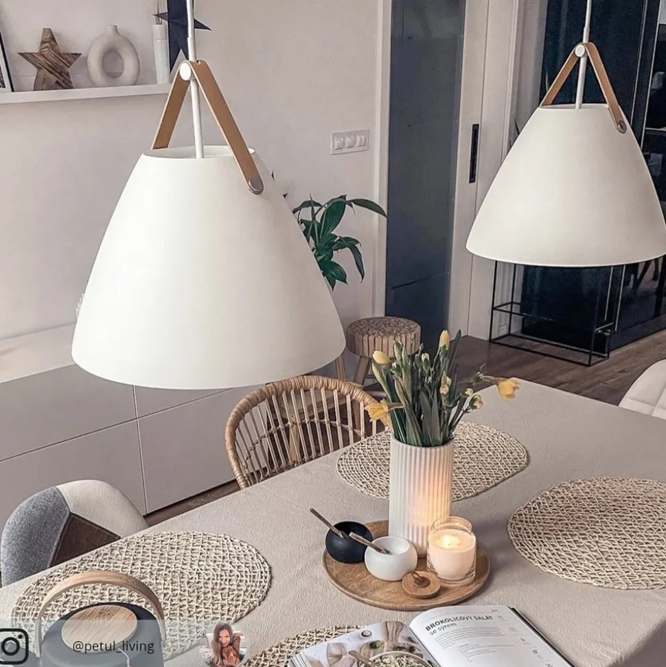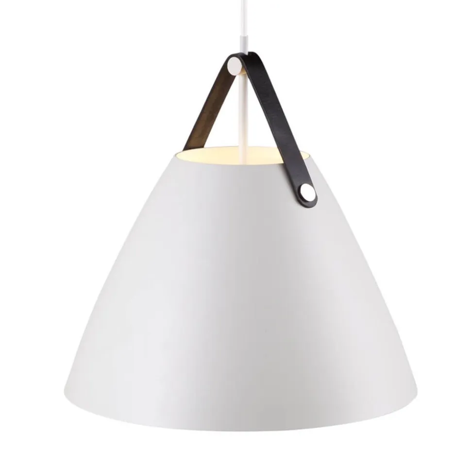 Hvad der er specielt ved Strap 36 LED-pendellampen, er dens ophæng. Den hvidlakerede metalskærm kan fastgøres med enten en sort eller brun lædersnor, idet lampen leveres med begge, hvormed der kan skabes et individuelt udseende. Takket være det 3 meter lange tekstilkabel kan pendellampen placeres mange steder, inklusiv i rum med høje lofter. For at oplyse spisebordet, bordet eller disken i køkkenet på en energibesparende måde, skal der anvendes en E27 LED lyskilde (se tilbehør).