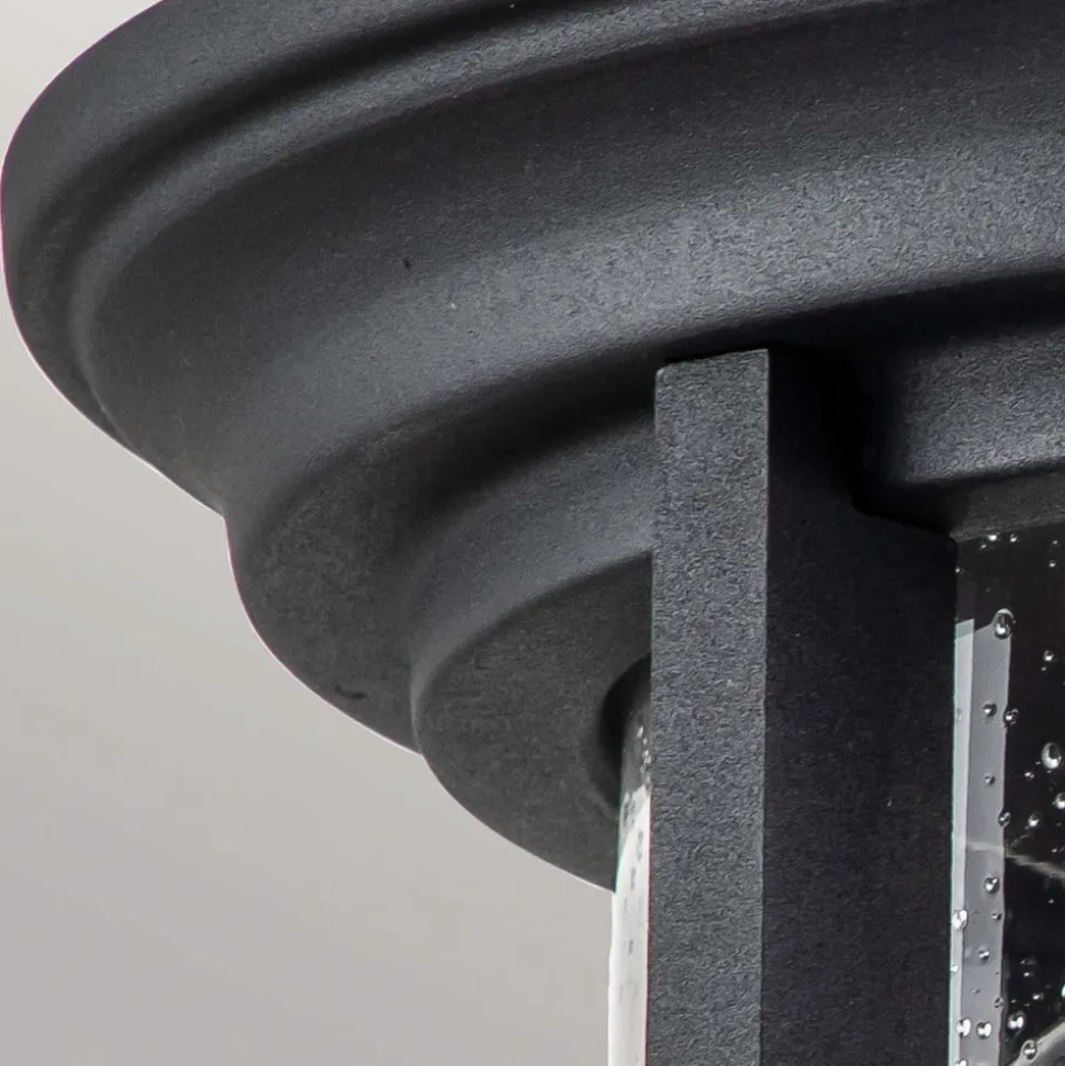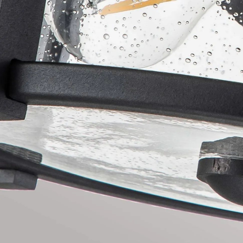 Merrill loftslampe til udendørs brug Den runde Merrill loftslampe i sortlakeret stål passer til mange byggestile og er ideel til belysning af terrasser, balkoner eller indgangspartier. Den transparente glasskærm med bobler indeholder to E27-fatninger, hvor transparente glødelamper ser særligt attraktive ud