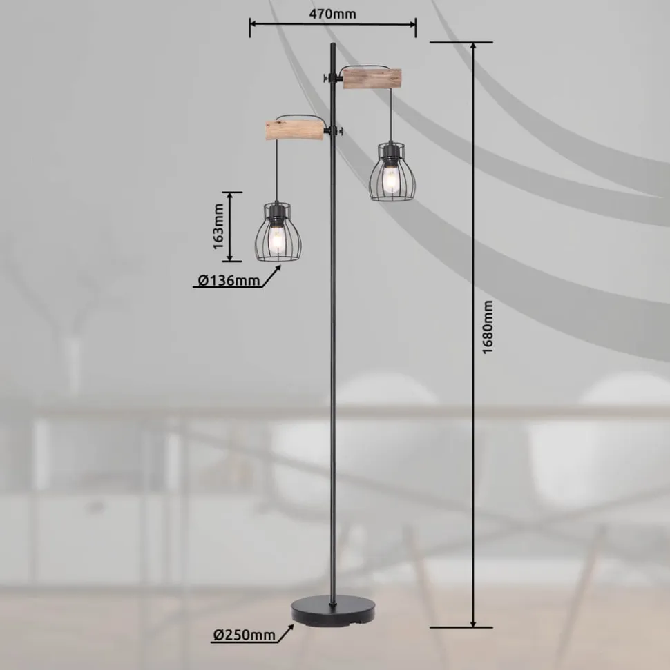 Mina gulvlampe med trædetaljer og burskærm Den to-lampede Mina gulvlampe imponerer med sit enkle, ret diskrete design. Lampen er lavet af metal og har en tænd/sluk-kontakt. To E27-fatninger med maksimalt 40W pr. fatning giver dig mulighed for selv at vælge den rigtige pære. LED-pærer anbefales på grund af deres energibesparelser og lange levetid.