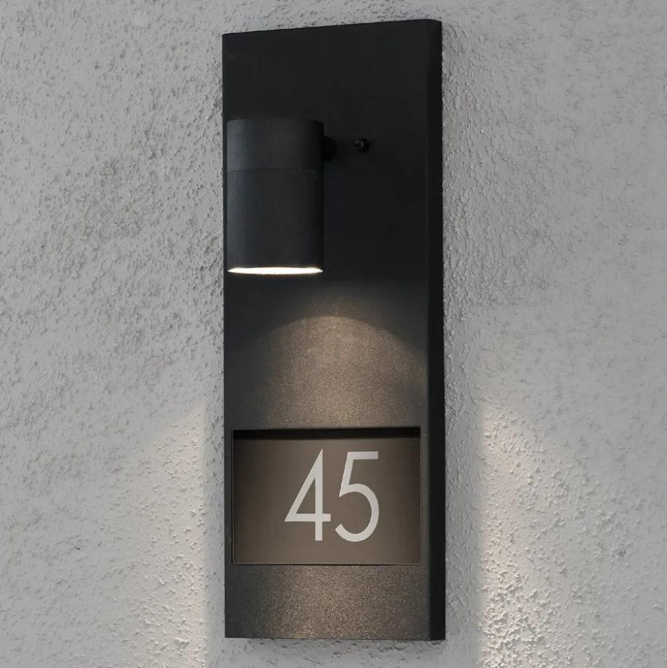 Modena 7655 er en husnummer- og udendørs væglampe i én. Det enkle design understreger den moderne fremtoning. En lille spot belyser cifrene nedenunder. Levering omfatter tal (3 x 0-9).