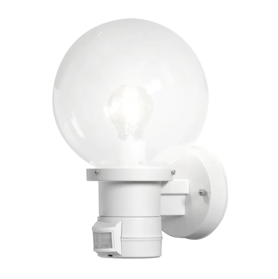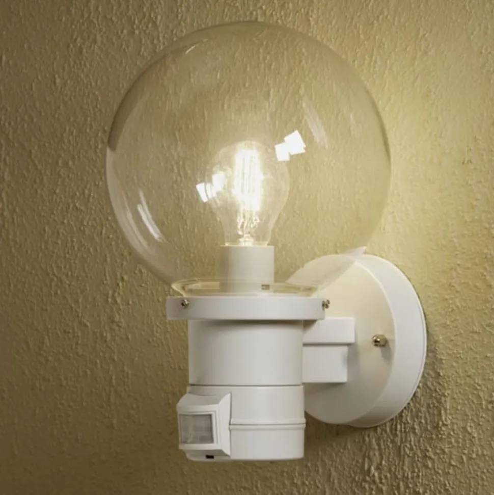 Udendørs væglampe Nemi med en stor akrylkugle og bevægelsesdetektor
