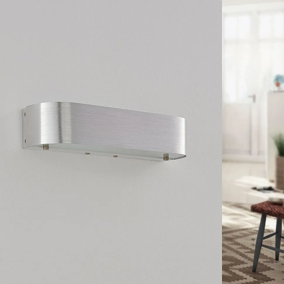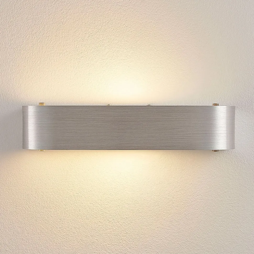 Afrundet aluminiumsvæglampe Nika med E14-fatning Aluminiumsdækslet, som er hovedkomponenten i Nika-væglampen, har en let afrundet form, som giver den et særligt harmonisk udseende. Dette design skaber også en særlig smuk lyseffekt, når Nika er tændt. Det skyldes naturligvis, at metal aldrig er gennemskinneligt, og at lyset derfor kun kan slippe ud, hvor der ikke er metal. I dette tilfælde gælder det toppen og bunden af væglampen. Der er matterede glasdæksler, hvilket betyder, at lyset ikke kun kan slippe indirekte ud, men også mere jævnt. Der er en E14-fatning inde i lampen, som også kan udstyres med en LED-pære. Det er en god måde at spare energi på, samtidig med at man bevarer en passende lysstyrke.