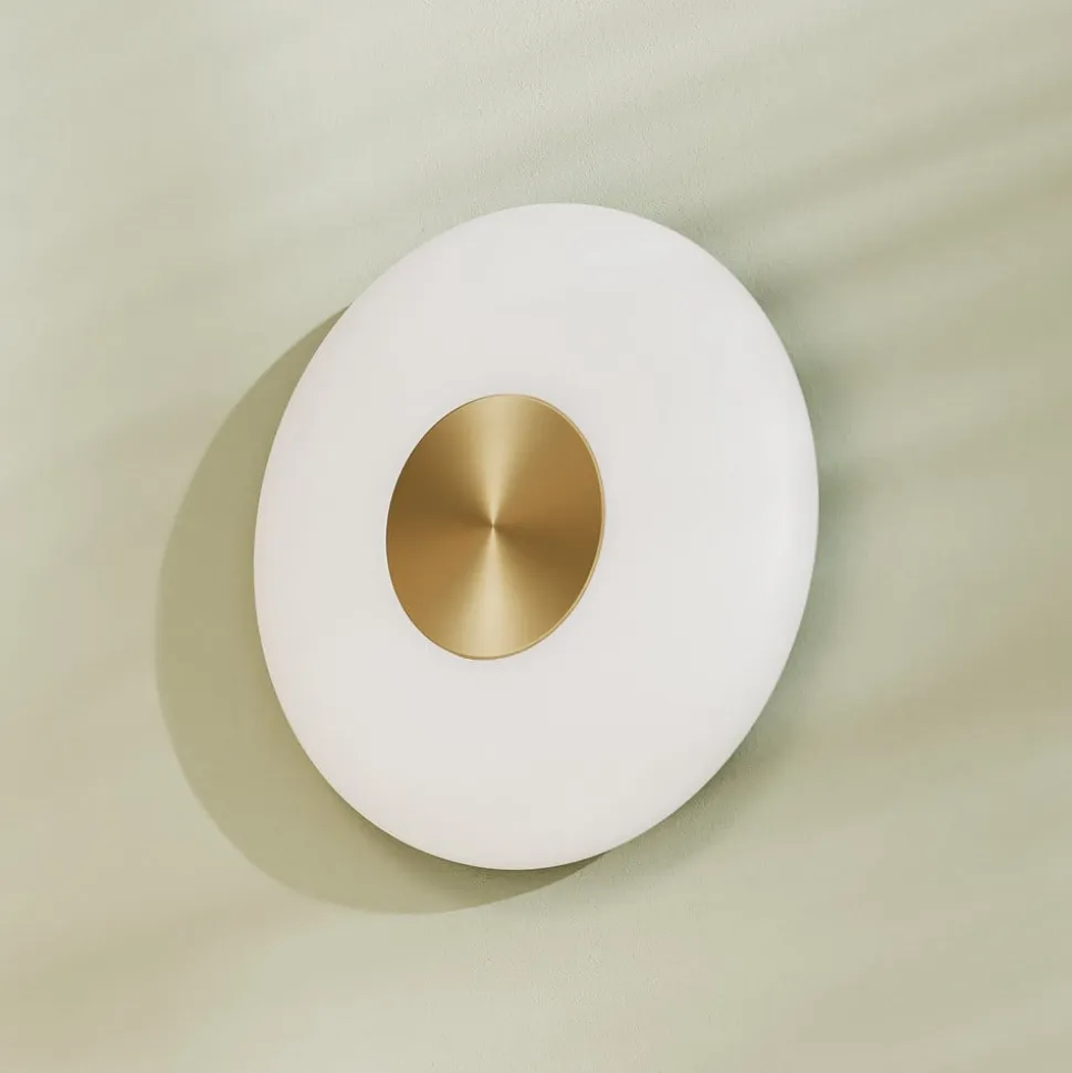 LED-væglampe Glint er udstyret med et aftageligt kabel med stik og afbryder og kombinerer stilfuldt design med behagelig og energibesparende belysning. Lampen er fremstillet af højkvalitetsglas og metal og har en elegant, opal hvid, flad og rund mundblæst skærm og et messingelement i midten. Den integrerede LED-lyskilde giver et varmhvidt lys, der skaber en behagelig atmosfære i rummet. Med en farvegengivelse på 85 Ra fremstår farver naturlige og levende.