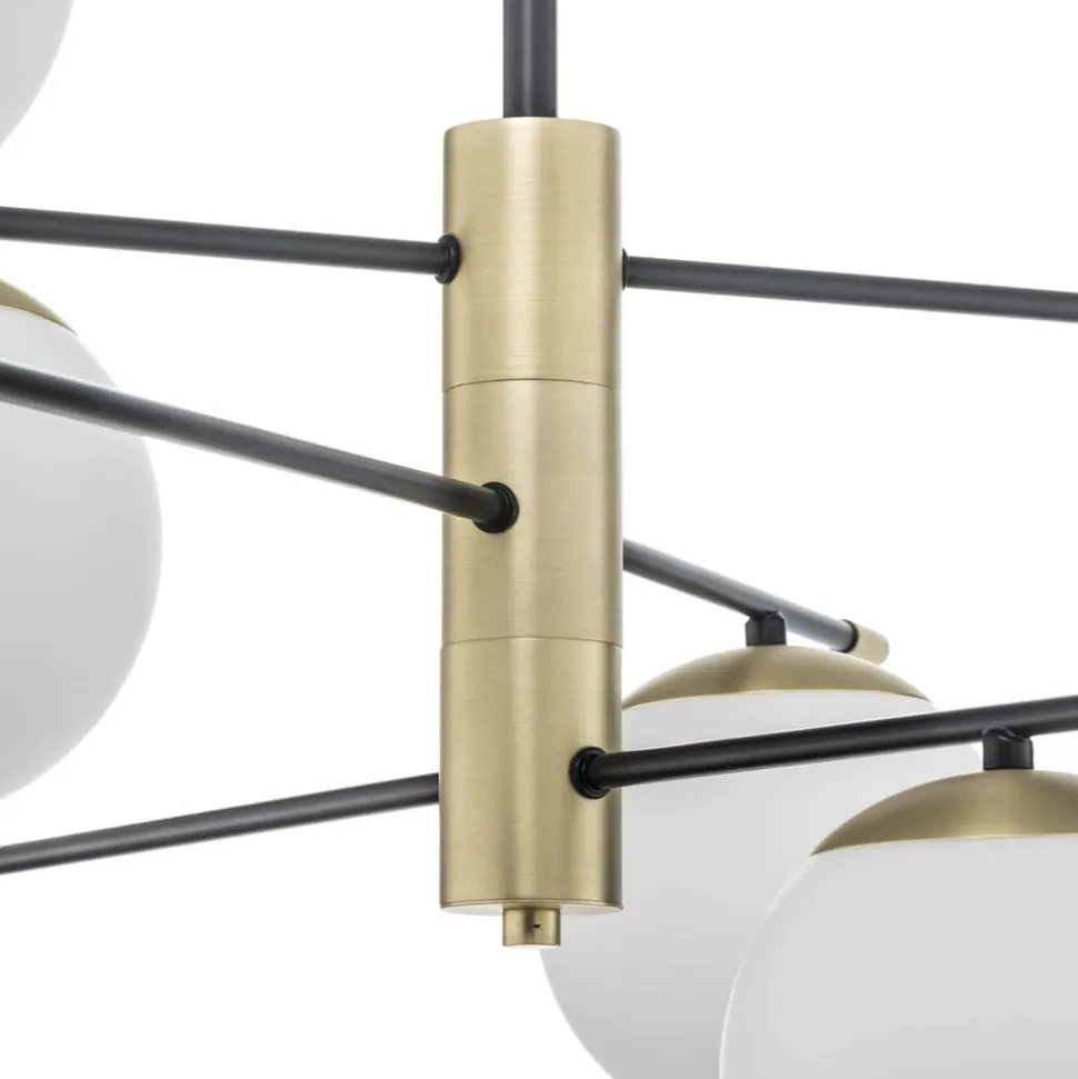 Lige linjer og sfærer – disse geometriske elementer bestemmer udseendet på den seks-flamme Nostalgi-pendel og giver, ligesom farverne mat guld, sort og hvid, en moderne elegance, der kan integreres i mange rum. Tre lige metalstænger er fastgjort til ophængningsstangen i midten. Dette skaber en lys rumbelysning fra en hængende lampe, der er en absolut iøjnefaldende, selv når den ikke er oplyst.