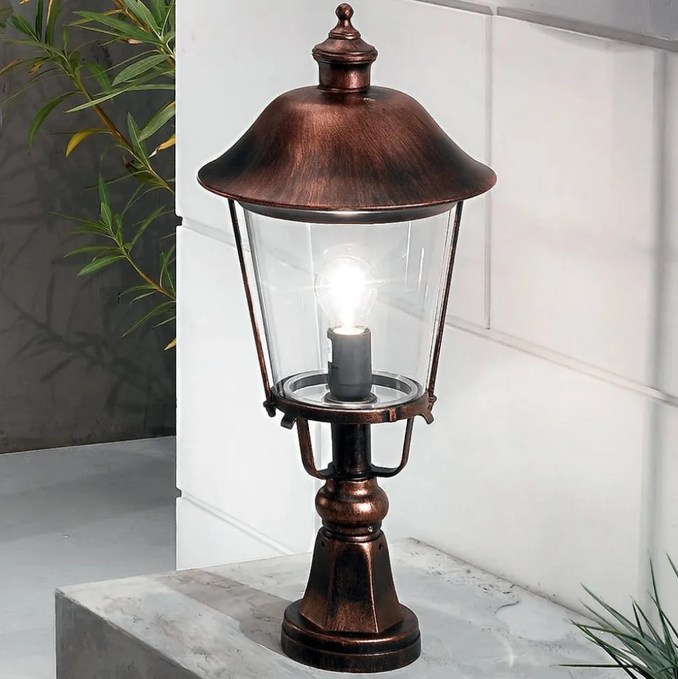 Sokkellampen MARIELLAs skærm giver den en charmerende og nostalgisk udstråling. Den ligner en klassisk udendørslygte med en sort og kobberfarvet overflade. Sokkellampen passer godt på en mur eller andre forhøjninger, og skaber en god atmosfære rundt om huset.