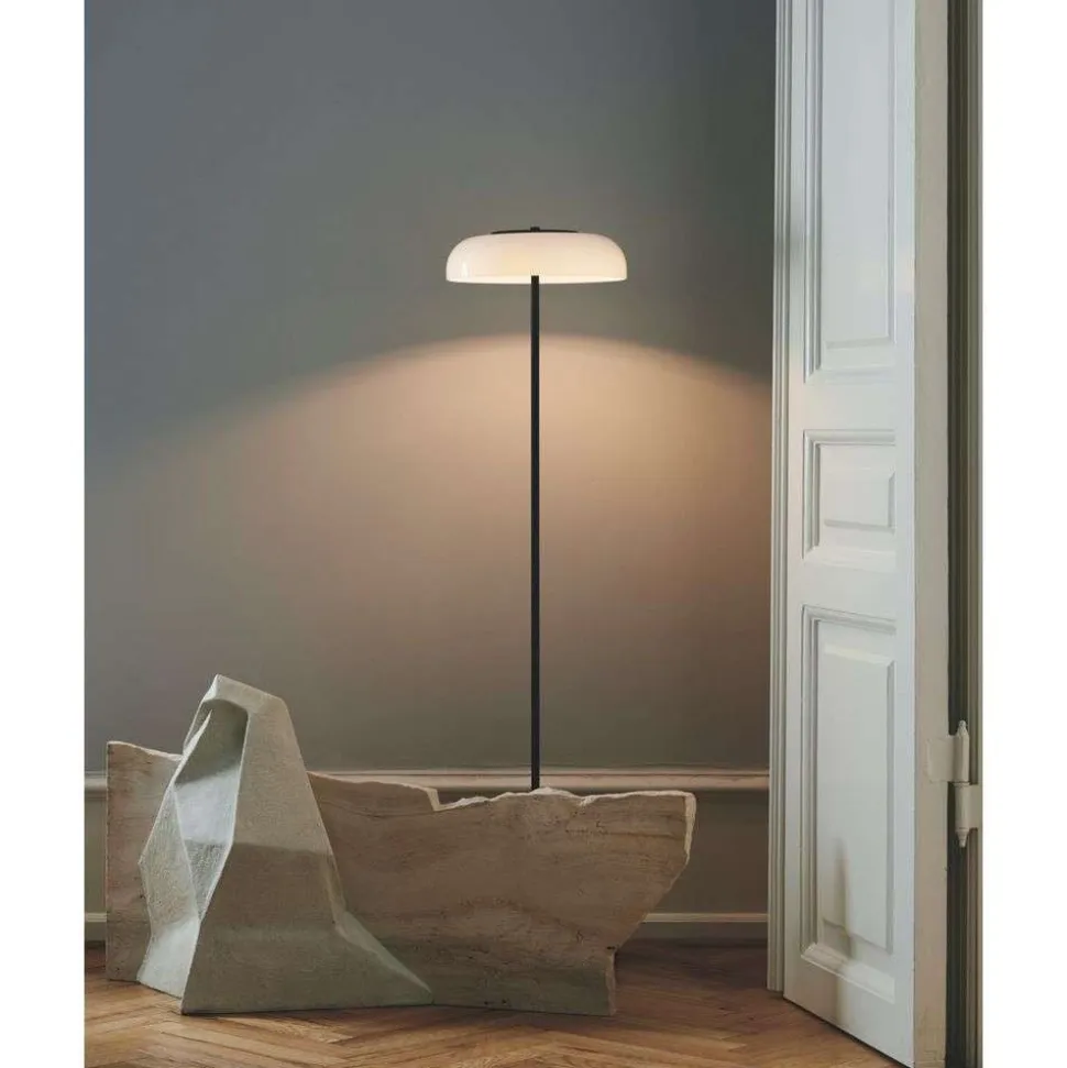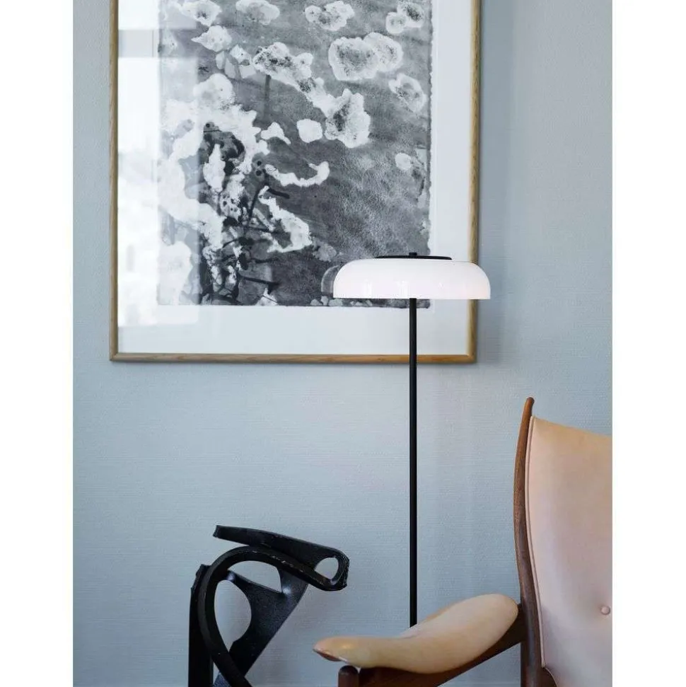 Sort pulverlakeret LED-gulvlampe Blossi med opal glas
