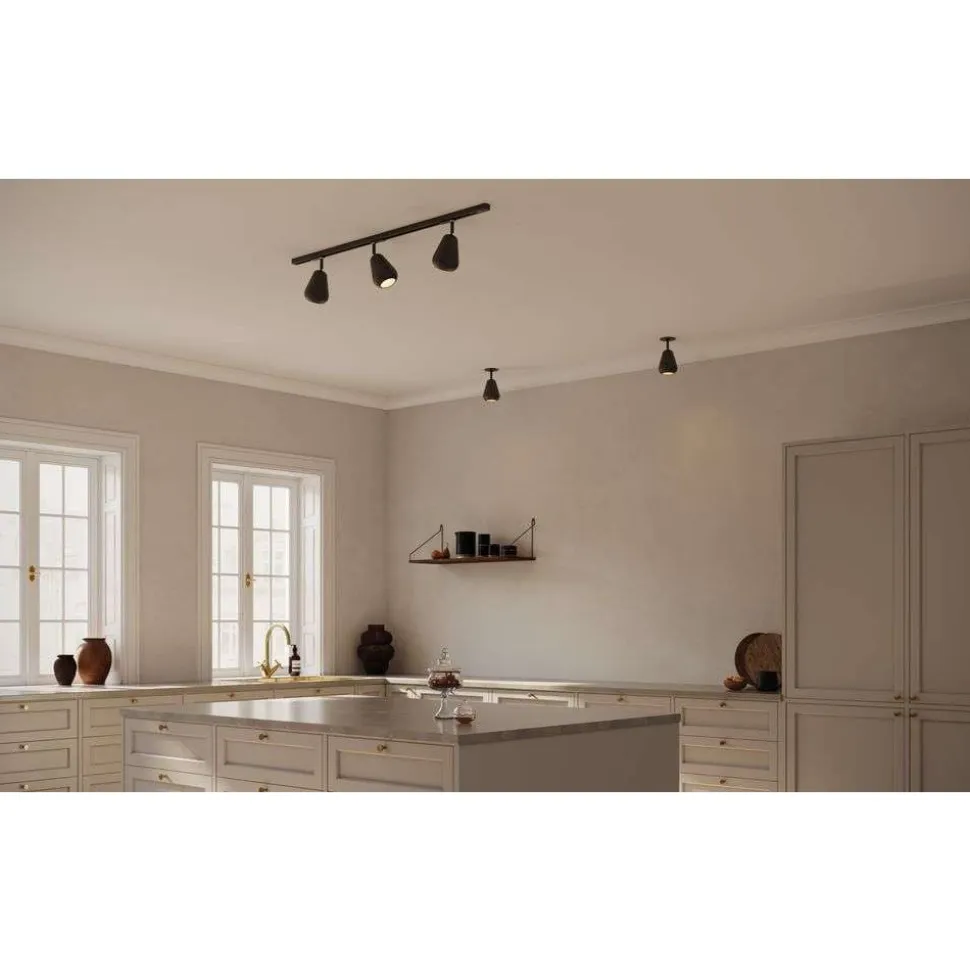 Anoli Spot Track loftslampe fra Nuura kombinerer minimalistisk skandinavisk design med højkvalitets metal. Den elegante sorte farve og det klare formsprog gør den til et alsidigt belysningselement, der nemt kan integreres i forskellige rumkoncepter som stuen, spisestuen eller køkkenet. Loftlampen leveres med tre skærme og en skinne. Skærmene kan skubbes frem og tilbage over hele skinnebredden, så lampen kan tilpasses forskellige formål og behov.