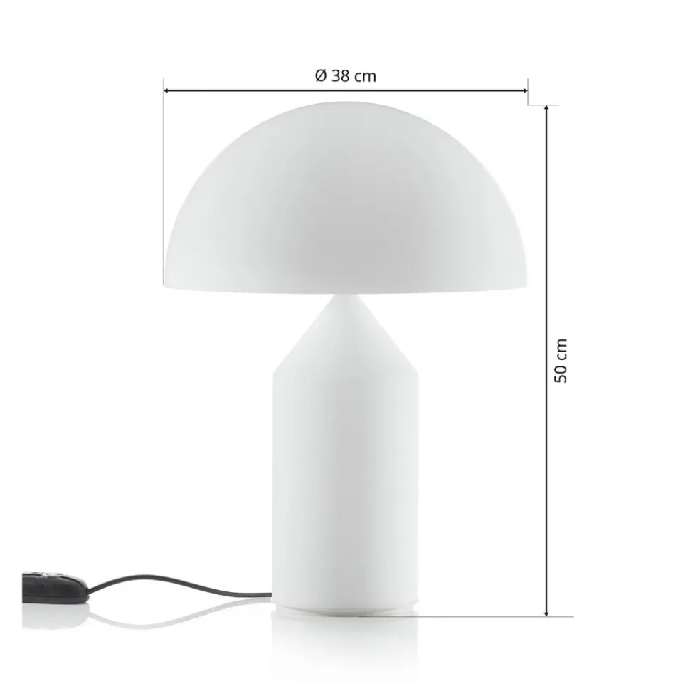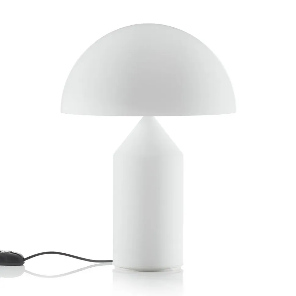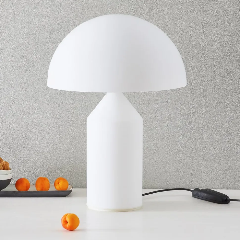 Uforlignelig Atollo-bordlampe – et ægte designerstykke lavet af blæst Murano-glas Atollo-bordlampen blev designet første gang i 1977 og har ikke mistet noget af sin charme den dag i dag. Den har vundet adskillige priser i årenes løb og kan findes på mange museer rundt om i verden som en designklassiker. Lampen med den karakteristiske svampeform har et meget let og ubekymret udseende takket være dens opalhvide design og brugen af Murano-glas. I alt to lyskilder – en i basen og en i skærmen – giver både direkte og diffust lys. En lysdæmper kan også bruges til at skabe individuelle stemninger i rummet. Oluce – italienske designerlamper siden 1945 Siden grundlæggelsen i 1945 har Oluce været en af de førende italienske producenter af designerlamper. I løbet af de seneste årtier har italienske og internationale designere udviklet lyskreationer til Oluce, som er blevet sande ikoner inden for lyskunst. Erfaring med fremstilling af armaturer og høje kvalitetsstandarder i valget af materialer er grundlaget for de visuelt tiltalende, men funktionelle og effektive armaturer fra Italien. At skabe en perfekt syntese af form og indhold har altid været Oluce-designernes maksime.