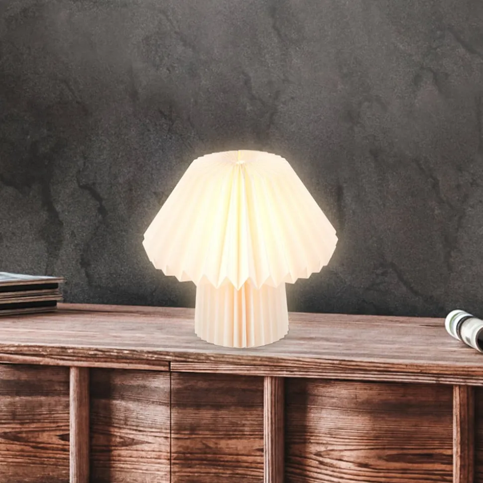 Origami bordlampe – stille ekstra lyskilde til interiøret Navnet på denne bordlampe beskriver konceptet: Origami er lavet af hvidt, foldet papir, som danner formen af en klassisk bordlampe med en skærm i form af en afkortet kegle og en cylindrisk base. Indeni er der plads til en E14-lampe, hvis lys udstråles blidt til alle sider. Origami er det perfekte tilbehør til skænk og natbord. Udstyret med en afbryder på kablet.