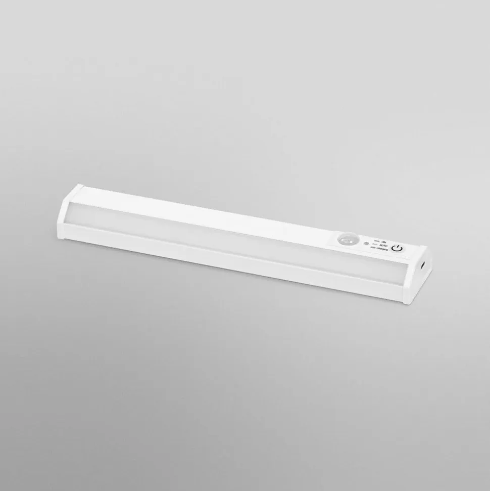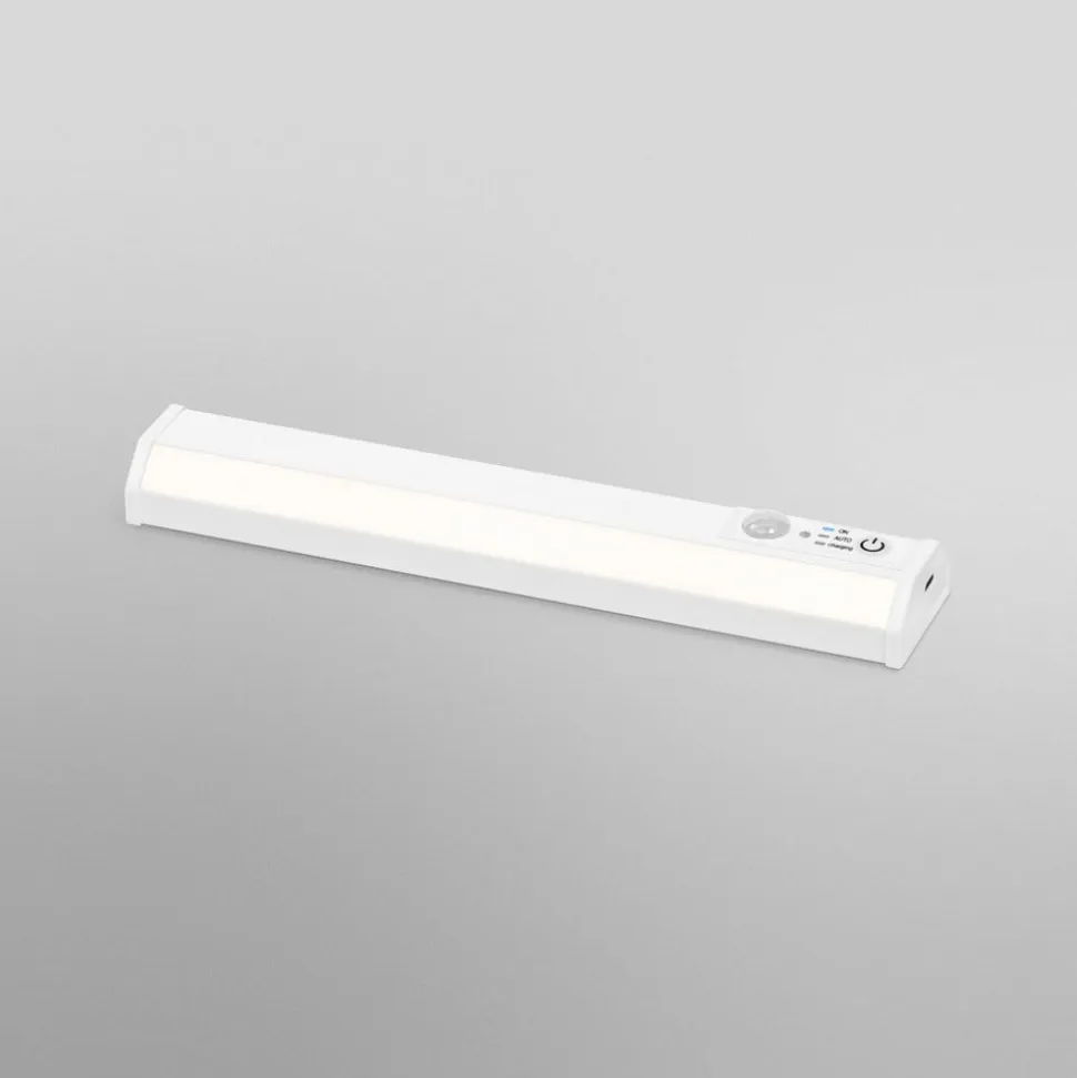 Underskabslampe til fleksibel montering, med bevægelsessensor, indirekte belysning, batteridrevet, genopladelig. Produktegenskaber: Genopladeligt batteri via USB-kabel. PIR-bevægelsessensor og dagslyssensor. Farvetemperatur: 4.000 K. Produktfordele: Tilbehør til fleksible monteringsmuligheder medfølger. Blødt lys gennem indirekte lysfordeling. Anvendelsesområder: Overskabe. Hylde- og underskabsbelysning. Køkkener, arbejdsområder. Kun til indendørs belysning. Teknisk udstyr: USB-opladerkabel.