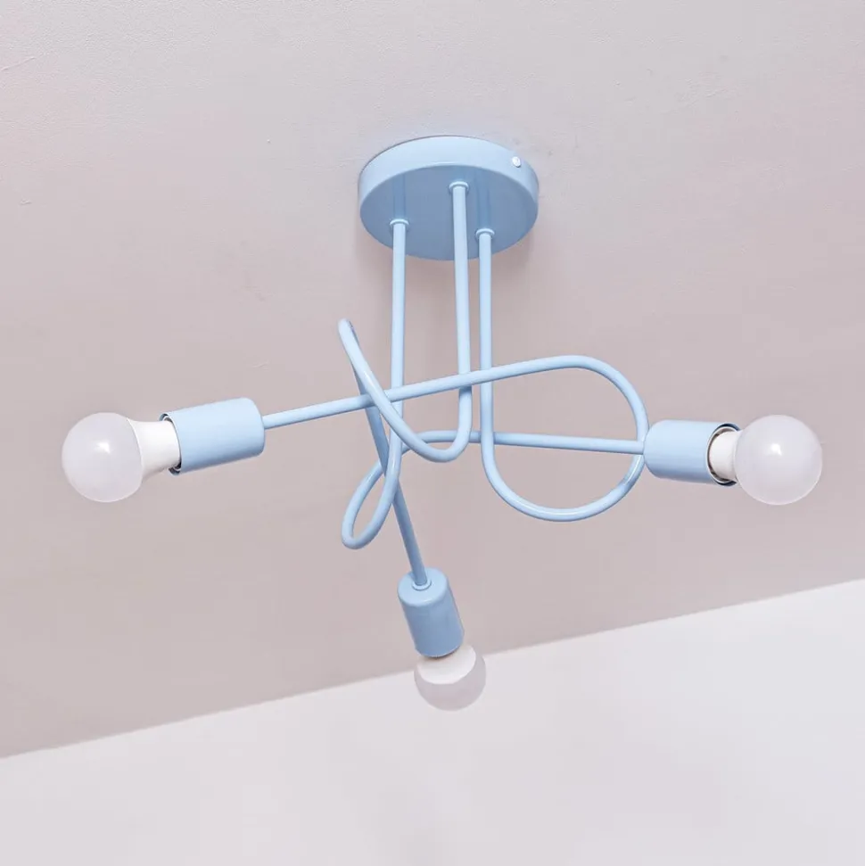 3 lyskilder Oxford loftlampe i lyseblå Oxford loftlampen i lyseblåt metal kombinerer stilfuldt design med funktionel belysning. De tre lampearme strækker sig nedad fra den runde baldakin ud i rummet og fletter sig ind i hinanden som en løs knude. Oxford-loftlampen er udstyret med en standardiseret E27-fatning, så LED-loftlampen nemt kan udskiftes, hvilket bidrager til et effektivt energiforbrug. Den robuste metalkonstruktion sikrer holdbarhed og passer harmonisk ind i forskellige indretningsstile. Oxford loftlampen er derfor et ideelt valg for dem, der sætter pris på kvalitet og æstetisk variation.