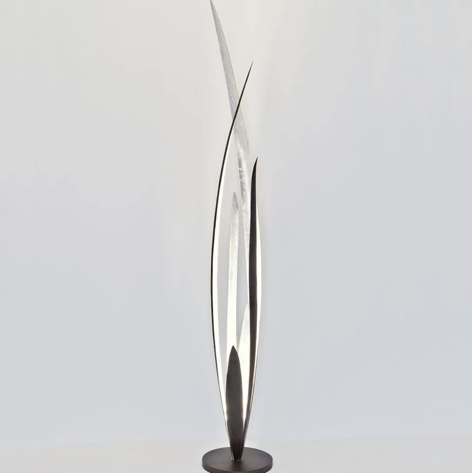 Palustre gulvlampe i sort, brun og sølv Palustre-gulvlampen har et meget naturligt design, der minder om en plante med aflange blade. På grund af den kølige farve ser den særlig elegant ud og kan integreres i en række forskellige rumkoncepter. Armaturet er oplyst fra indersiden af sin base. Lyset reflekteres i forskellige retninger af de aflange, sølvfarvede jernblade, der strækker sig op mod loftet. På grund af kroppens form skaber lampen, der er sortbrun på ydersiden, et dynamisk såvel som naturligt indtryk.