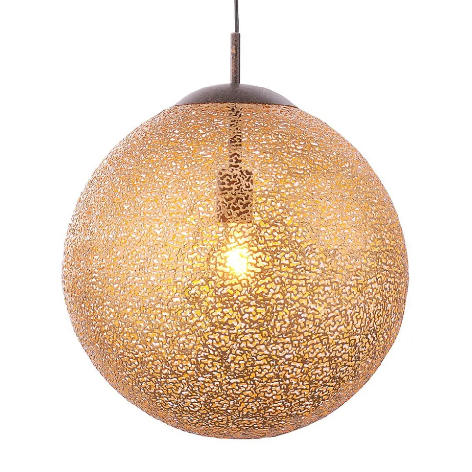 Greta – en hængelampe med en kugleformet skærm med et smukt mønster, 40 cm Kombinationen af baldakinens og skærmens rustbrunt lakerede metal og den guldfarvede kugleformede skærm med et smukt, gennemskinneligt mønster gør Greta hængelampen til en lyskilde, der ikke kun giver en hyggelig belysning, men også er et smukt dekorativt element over et bord. Flere lamper – eventuelt i forskellige størrelser – monteret som en gruppe ser også meget attraktive ud. Udstyret med alle typer pærer med E27-sokkel giver Greta-pendlen også energibesparende belysning.