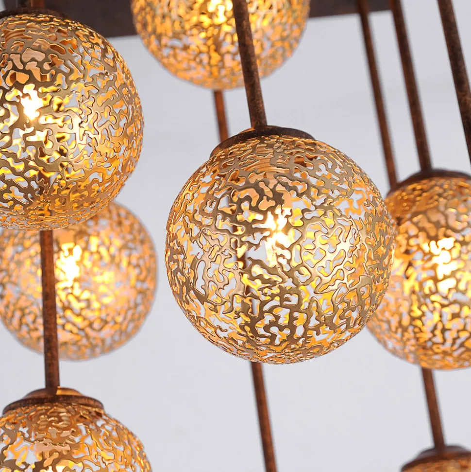 Greta – en loftlampe med 9 lyskilder, der fanger øjet Ni kugleformede skærme af stemplet metal med et smukt mønster og guldfarvet finish er jævnt fordelt og ophængt fra den firkantede baldakin på stive arme i forskellige højder. En skærm er monteret direkte i midten af den rustfarvede baldakin. Lampearmene er også rustfarvede, hvilket skaber en smuk kontrast til skærmene og fremhæver de kugleformede skærme. Loftlampens lyseffekt er også speciel, da skærmene kun er gennemskinnelige på grund af udskæringerne. Greta loftlampen kan også dæmmes med en ekstern lysdæmper (f.eks. drejedæmper på væggen) via husets installation. Dæmpere og pærer er ikke inkluderet i leveringsomfanget.