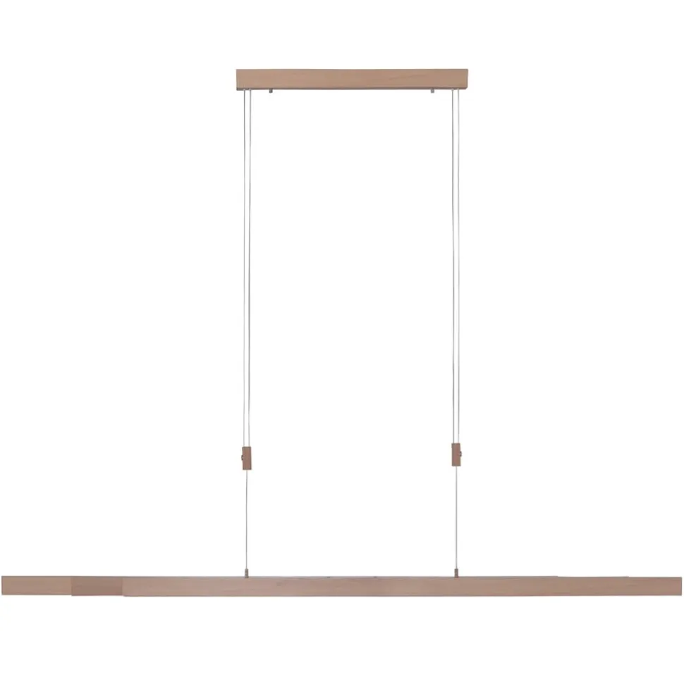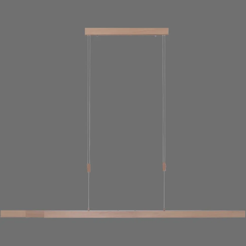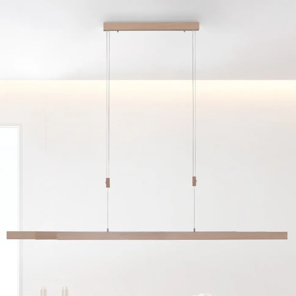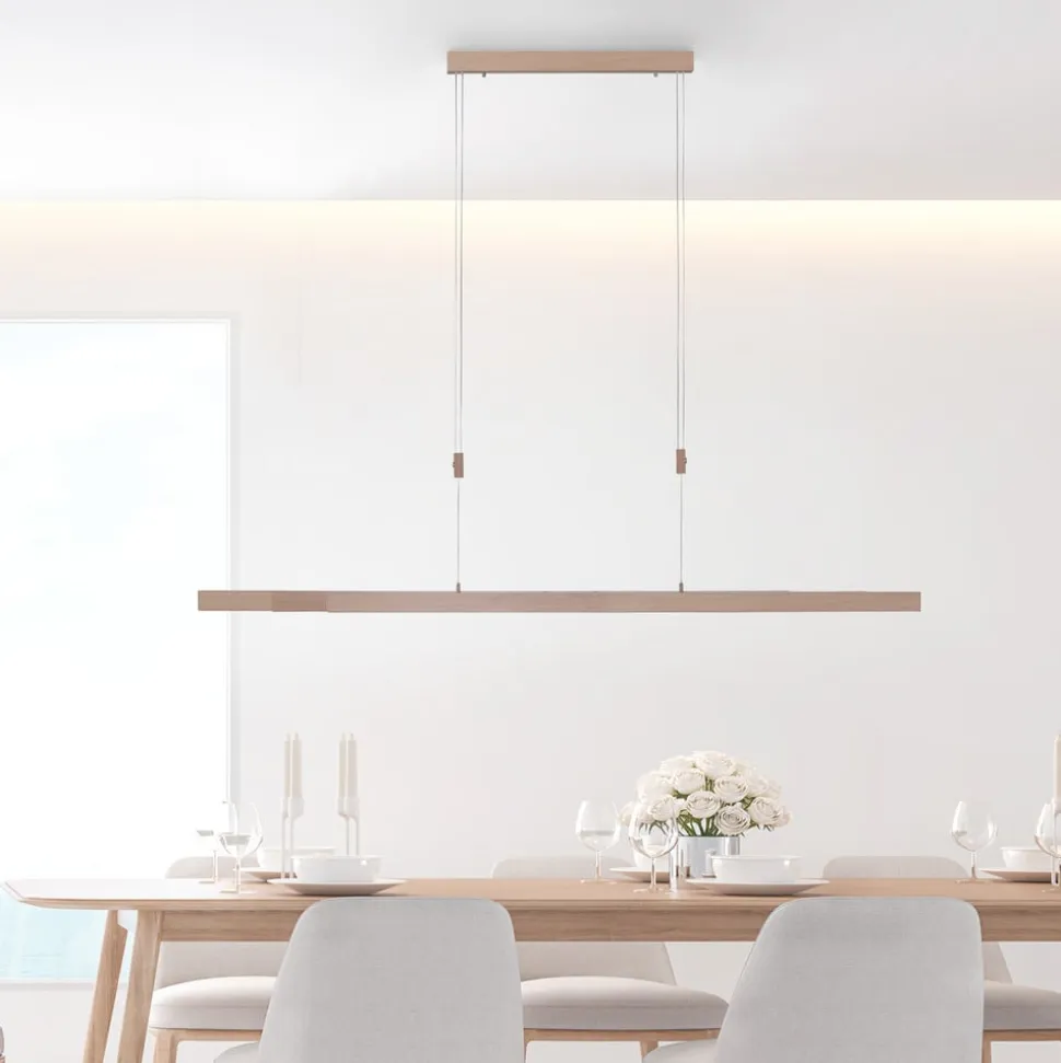 Justerbar Adriana LED-hængelampe med touchfunktion Denne praktiske pendellampe i trædekor-look kan trækkes ud og justeres variabelt i højde og længde, så den kan tilpasses over spisebordet. Lampen har to berøringsflader. Det ene berøringspunkt kan bruges til at tænde og slukke lyset og til at ændre lysstyrken. Den anden berøringsflade kan bruges til at styre lysfarven kontinuerligt fra varmhvid til kølig universalhvid ved hjælp af den integrerede CCT-teknologi. Takket være hukommelsesfunktionen gemmes den sidste indstilling og kan hentes frem igen, når der tændes. Højden kan justeres fra 100 cm til 180 cm med få enkle trin. Længden kan justeres fra 120 cm til 179 cm.