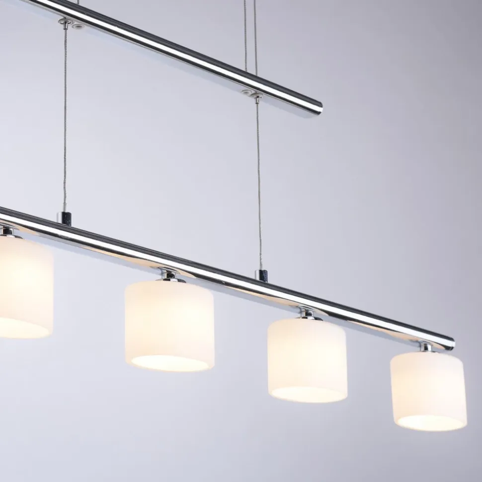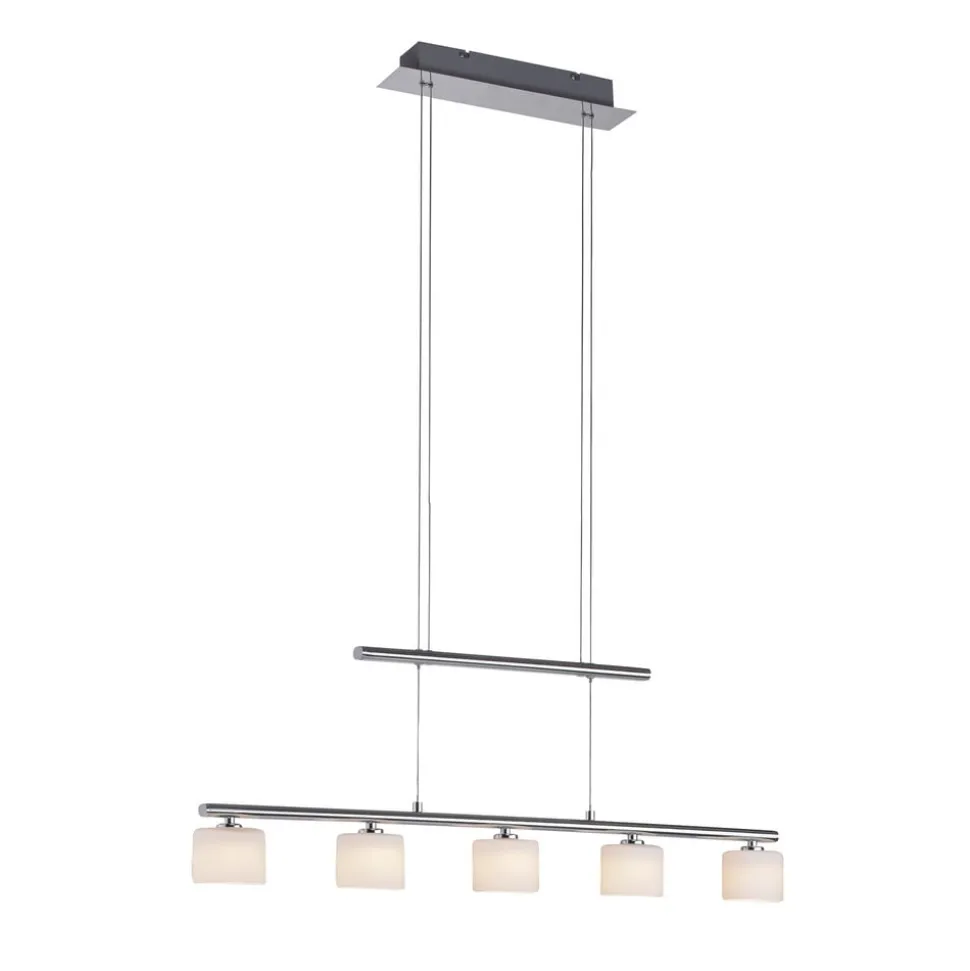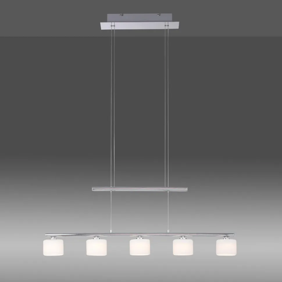 Højdejusterbar Hydra LED-hængelampe af aluminium og glas Hydra LED-hængelampen er ideel til belysning af spiseborde. Højden på pendellampen i bjælkeform kan til enhver tid varieres takket være kabeltrækkonstruktionen. Lampen suppleres af fem lampeskærme af glas. Resultatet er, at lyset sendes blidt ud i omgivelserne uden at blænde.