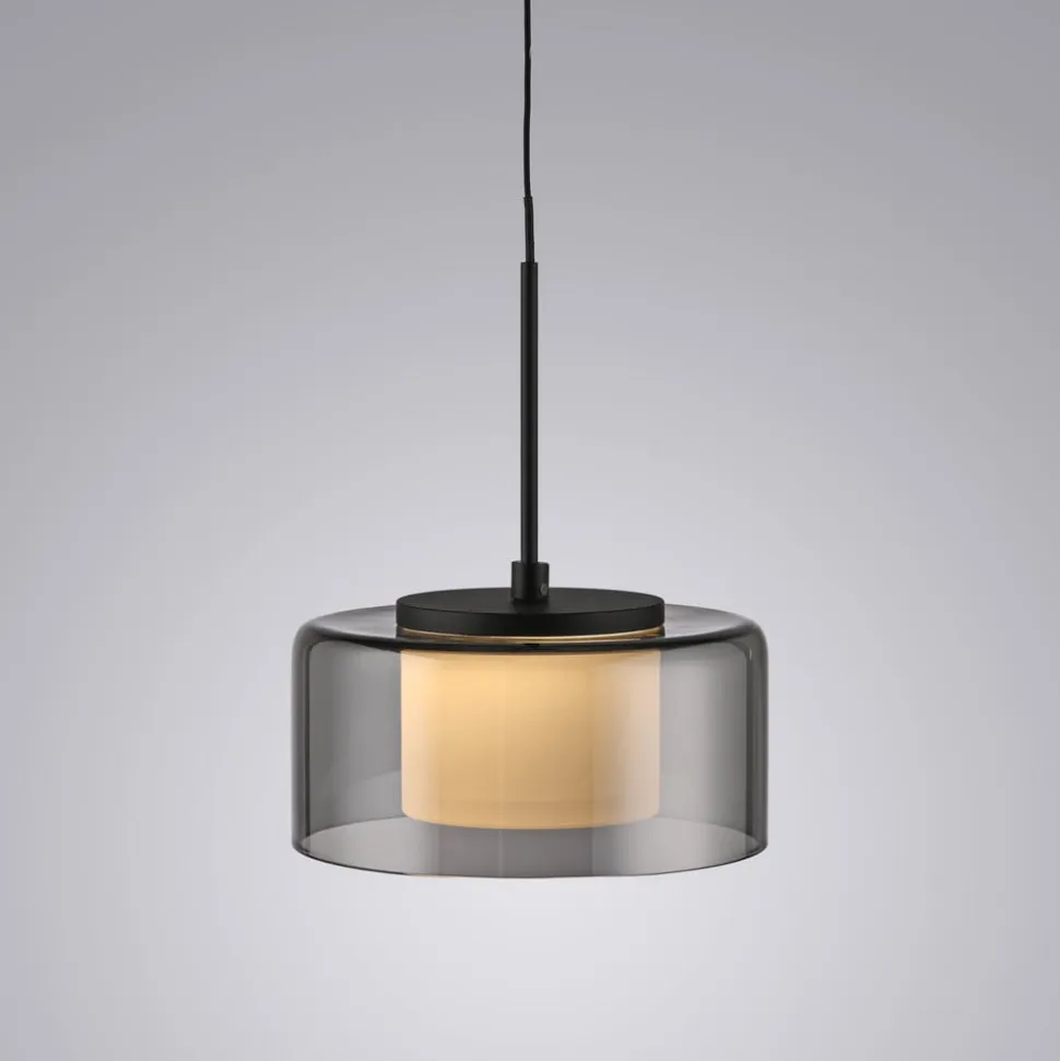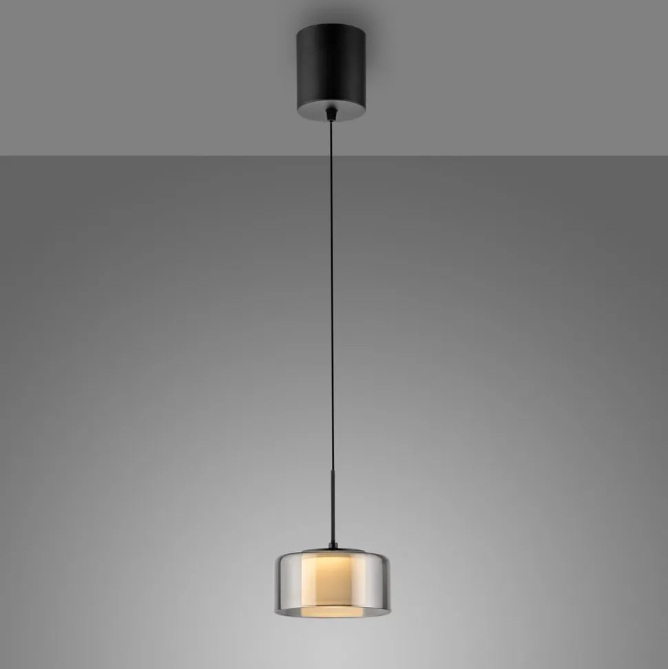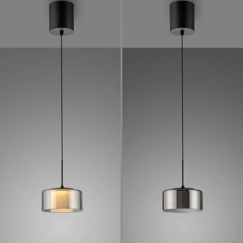 Moderne Rika LED-hængelampe af glas – dæmpbar via vægkontakt Den sorte Rika LED-hængelampe imponerer med sit moderne, enkle design. Takket være det røgfarvede glas og den varmhvide LED-pære udsender armaturet et blødt lys, der skaber en indbydende atmosfære over dit spisebord. Comfort-Lift-funktionen gør det nemt at justere højden. Takket være mekanismen, der er indbygget i baldakinen, er irriterende kontravægte ikke længere et problem. Højdejusteringssystemet gør det hurtigt og nemt for dig at justere højden på lampen, så den passer til din bolig. Lampen er udstyret med SimplyDim-teknologi. Denne funktion giver dig mulighed for nemt at dæmpe armaturets lysintensitet ved hjælp af den eksisterende lyskontakt. Lysdæmperteknologien styrer lysstyrken via koblingspulsen, så lyset kan dæmpes trinløst fra 100 % og ned til 10 % af lysintensiteten. Hvis lyset tændes igen mindre end 3 sekunder efter, at det er blevet slukket, starter dæmpningsprocessen. Når det har nået den lyseste (100 %) eller mørkeste værdi (10 %), forbliver det på denne indstilling i ca. 2 sekunder, før processen starter igen. Hvis lyset lyser med den ønskede lysstyrke under en proces, kan man spare på lysintensiteten ved at slukke for lyset. Hvis man tænder for lyset igen, lyser det med den gemte lysstyrke, og denne indstilling bevares. Det gør det muligt at justere lyset, så det passer til dine behov, og hurtigt finde det frem igen. Placer pendellampen over spisebordet, og indhyll rummet i en hyggelig atmosfære.