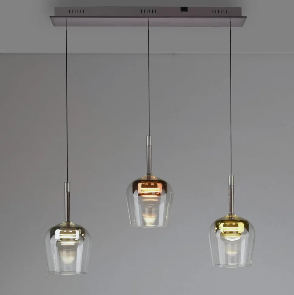 Q-Kon udendørs hængelampe med lampeskærme i glas og metaldetaljer – smart og kan styres med fjernbetjening Q-Kon hængelampen er både en æstetisk og funktionel tilføjelse til moderne stuer og opholdsrum. De tre lampeskærme, der hænger på række, er hver især udstyret med buet, gennemsigtigt glas, der smalner af i bunden. Hver skærm indeholder en aluminiumskrop med en finish i guld, bronze eller sølv. De nedadrettede LED-moduler giver direkte bord- eller områdebelysning. Takket være Comfort Lift kan højden på pendlen til enhver tid justeres manuelt, og en passende fjernbetjening til at tænde, dæmpe og justere farvetemperaturen er allerede inkluderet i leveringsomfanget. Ud over fri justering af lyset giver det også forudkonfigurerede muligheder, så den perfekte belysning er praktisk tilgængelig i næsten enhver situation. Alternativt kan Q-Smart-Home pendellampen integreres trådløst i ZigBee-baserede smart home-systemer (bro kræves) for at styre den via app eller stemmekommando, afhængigt af konfigurationen.