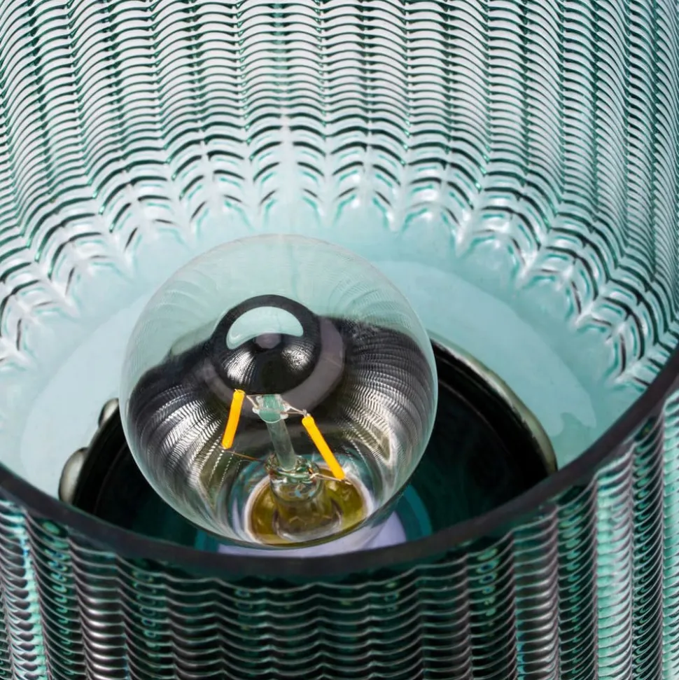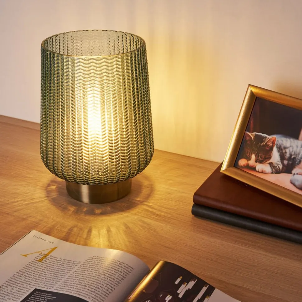 Pretty Glamour LED-bordlampe, batteridrevet Takket være batteridriften kan Pretty Glamour LED-bordlampen placeres hvor som helst, på hylder eller kommoder. Det farvede glas med gentaget mønster og den messingfarvede fod er en elegant kombination. Tekniske egenskaber – med afbryder: slukket / tændt (kontinuerlig drift) / timer (automatisk slukning efter 6 timer)