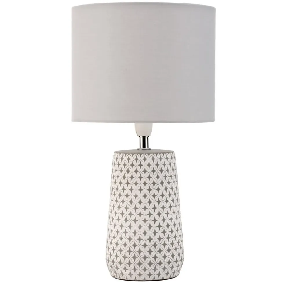 Pretty Purity – smuk purisme – navnet på denne bordlampe kunne ikke være mere passende. Lampens fod, der er designet med et dekorativt diamantmønster og den grå-hvide farvekombination, og den klassiske, cylindriske skærm af hvidt stof gør Pretty Purity bordlampen til en enkel, men meget alsidig og tidløs lampe, der passer ind i enhver indretning. Lampens afbryder er integreret i det tekstilbeklædte kabel. Bordlampen er perfekt som sengelampe, men gør også en god figur i stuen og er også ideel til vindueskarmen på grund af sin størrelse.