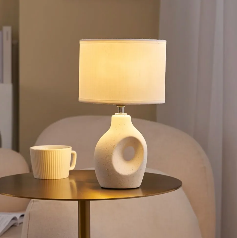 Pure Crush-bordlampe af hvidt stof og beige keramik Pure Crush-bordlampen er en hyggelig ekstra lyskilde i stuen og soveværelset. Den hvide, cylindriske skærm er lavet af tekstil. Foden, der skiller sig ud med sit asymmetriske design med et hul, er håndlavet af beige keramik. Inklusive ledning med afbryder.