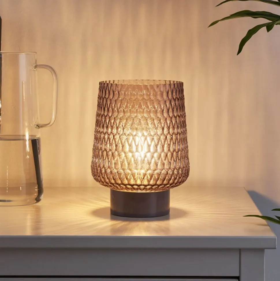 Batteridrevet Sparkling Glamour-bordlampe med glasskærm Med sit æstetiske grå glas giver Sparkling Glamour-bordlampen et behageligt lys i stuen eller soveværelset. Glassets stilfulde struktur gør denne bordlampe til et særligt dekorativt højdepunkt. Placeret harmonisk i ethvert opholdsrum skaber den en fantastisk lysatmosfære. Batteridriften giver dig mulighed for at flytte den mobile bordlampe hvor som helst og når som helst – uanset om der er en strømforsyning i nærheden. Den 6 timer lange timer slukker automatisk bordlampen igen. Vores tip: På større borde, f.eks. spisebordet, ser flere af disse lamper bedst ud ved siden af hinanden. Tekniske egenskaber – med kontakt: slukket/tændt (kontinuerlig drift) / timer (automatisk slukning efter 6 timer) – til 3 x AA-batterier (medfølger ikke)