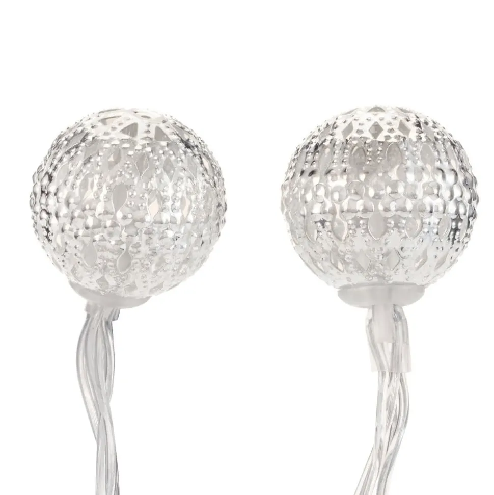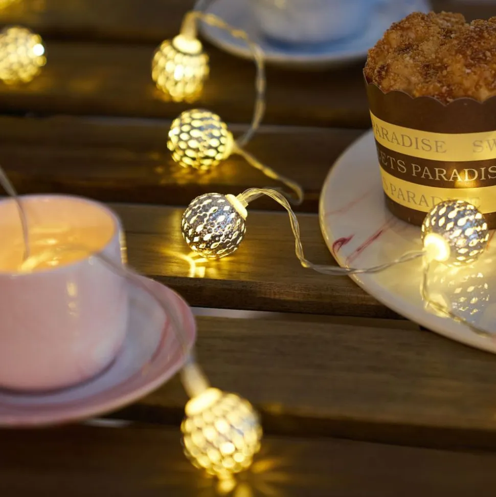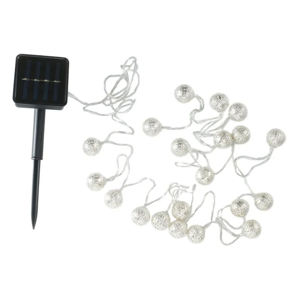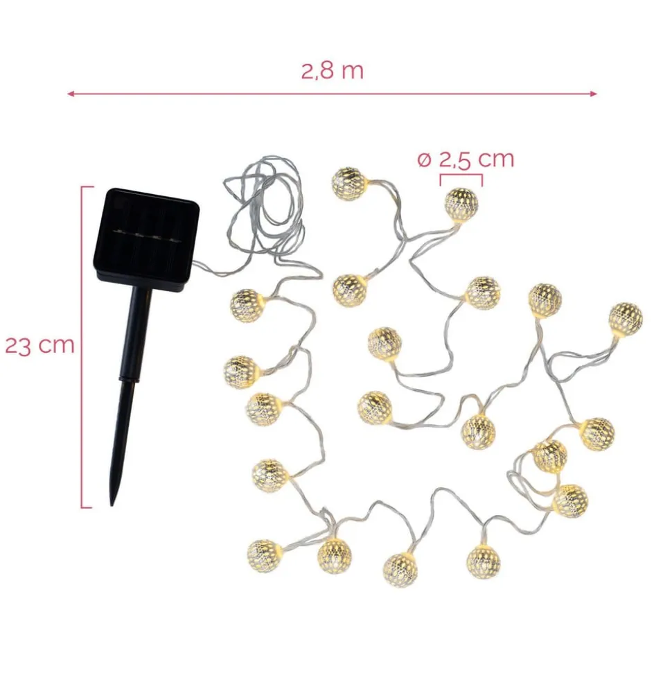 LED-lyskæde Sunshine Glamour med solcellemodulDen dekorative lyskæde Sunshine Glamour er udstyret med 20 små metalkugler i orientalsk stil. Solcellemodulet skal placeres i jorden på et solrigt sted, så lyskæden kan oplade sig selv i løbet af dagen i sollyset. Sunshine Glamour reagerer på ændringer i lysforholdene. Den tænder automatisk, når mørket falder på, og lyser derefter i op til 8 timer om dagen. Der kan vælges mellem to lystilstande: Glødende eller blinkende. Solar Fairy Lights har mange fordele: De er perfekte til terrassen, altanen eller haven, de kan placeres fleksibelt takket være solteknologien, de har et udskifteligt batteri og er stænktætte takket være IP-beskyttelse 44.