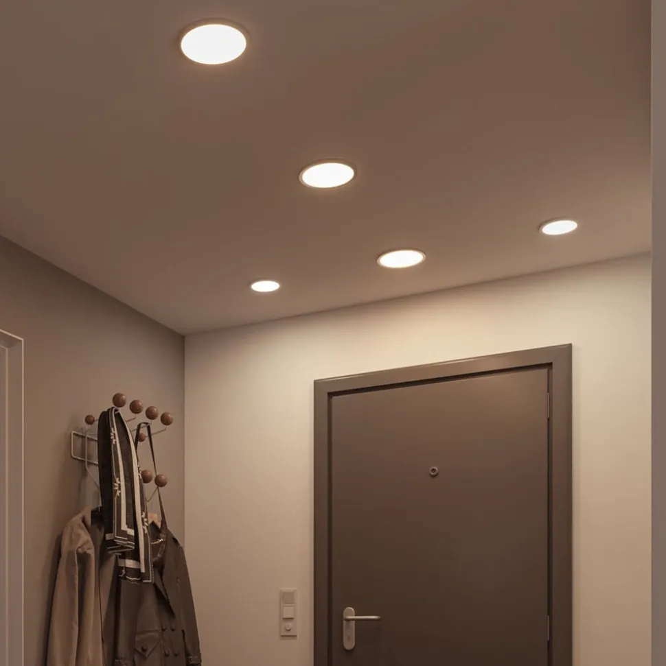 Rundt LED-indbygningspanel Areo VariFit, universalhvid, tretrins dæmpbar via vægkontakt Areo VariFit LED-panel til montering i loft eller væg er rundt, enkelt og fleksibelt. Med en lav indbygningshøjde på kun 1,2 cm og en smal ramme passer panelet ind i ethvert indretningskoncept. Det er udstyret med universelle hvide lysdioder, hvis lys skinner jævnt gennem diffusoren og kan skiftes til tre lysstyrkeniveauer ved hjælp af den eksisterende væglampekontakt. Hukommelsesfunktionen gemmer den valgte lysstyrke, indtil den tændes næste gang. Det indbyggede panel er ikke kun velegnet til nye installationer, men passer også ind i mange eksisterende installationsåbninger takket være de justerbare klemmefjedre på bagsiden. I kombination med flere armaturer i samme eller forskellige størrelser skaber panelet ikke kun et flot look, men giver også grundbelysning til større rum. Brug i badeværelset eller andre fugtige rum er også uproblematisk, da panelet har den passende beskyttelsesgrad IP44 – Justerbare fjederklemmer på bagsiden – 3 lysstyrkeniveauer 100%, 50% og 25%