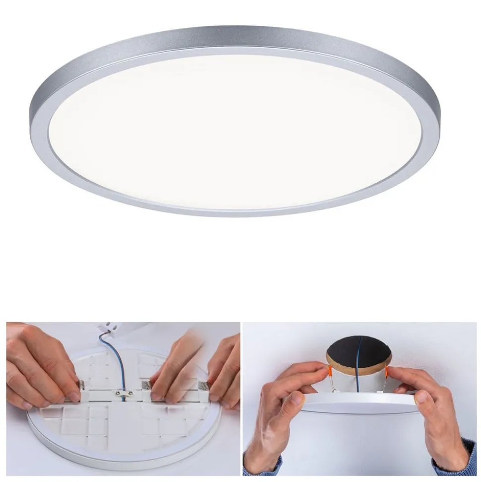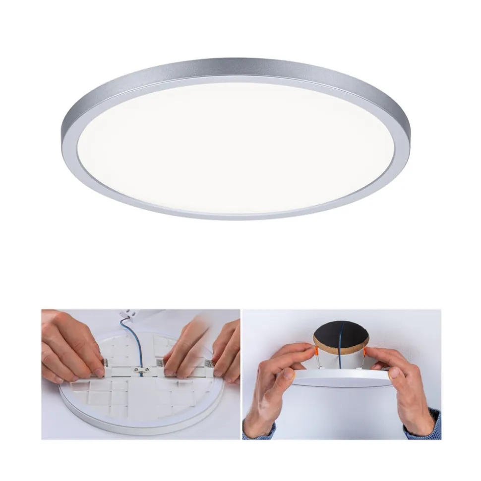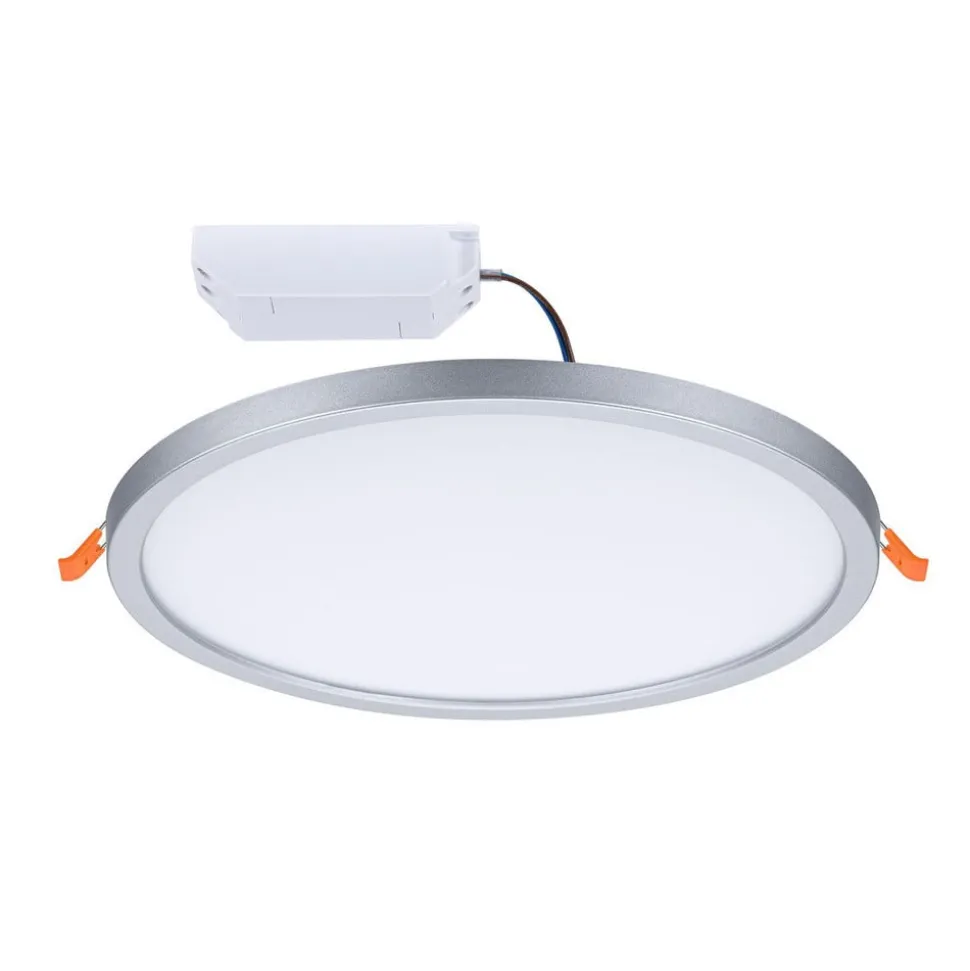 Rundt LED-indbygningspanel Areo VariFit, universalhvid, tretrins dæmpbar via vægkontakt Areo VariFit LED-panel til montering i loft eller væg er rundt, enkelt og fleksibelt. Med en lav indbygningshøjde på kun 1,2 cm og en smal ramme passer panelet ind i ethvert indretningskoncept. Det er udstyret med universelle hvide lysdioder, hvis lys skinner jævnt gennem diffusoren og kan skiftes til tre lysstyrkeniveauer ved hjælp af den eksisterende væglampekontakt. Hukommelsesfunktionen gemmer den valgte lysstyrke, indtil den tændes næste gang. Det indbyggede panel er ikke kun velegnet til nye installationer, men passer også ind i mange eksisterende installationsåbninger takket være de justerbare klemmefjedre på bagsiden. I kombination med flere armaturer i samme eller forskellige størrelser skaber panelet ikke kun et flot look, men giver også grundbelysning til større rum. Brug i badeværelset eller andre fugtige rum er også uproblematisk, da panelet har den passende beskyttelsesgrad IP44 – Justerbare fjederklemmer på bagsiden – 3 lysstyrkeniveauer 100%, 50% og 25%