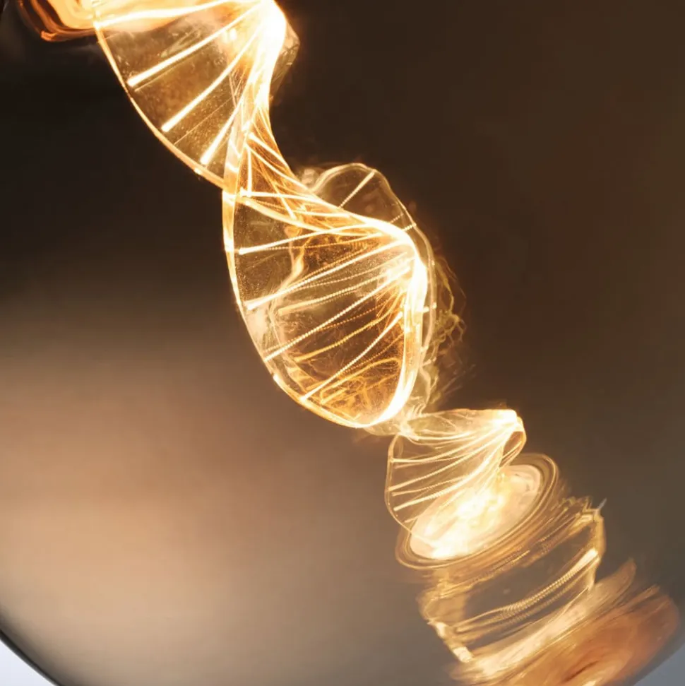 LED globepære E27 3,5W Filament Helix 1.800 K, guldfarvet glas LED’erne i denne LED globepære med E27-sokkel er arrangeret på en helt særlig måde. Den dekorative pære ser godt ud i enhver fatning uden skærm og giver et absolut blændfrit og meget hyggeligt lys takket være den fine lasergravering, perfekt som dekorativ lampe i stuen. En del af lyset udsendes direkte nedad gennem den oplyste ring i bunden af pæren – Varmt gyldent lys 1.800 K – Kun egnet til dekorativ belysning, ikke til almen belysning