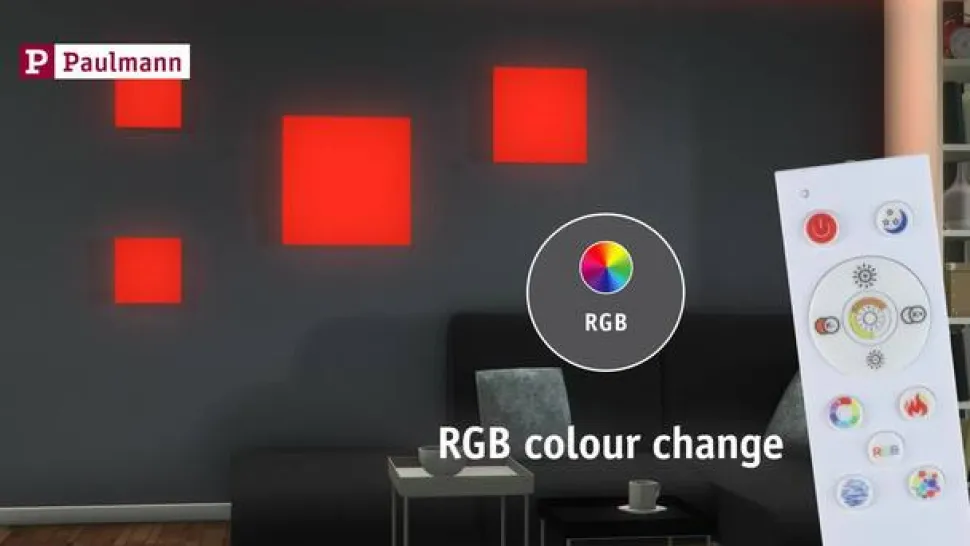 LED-panel Velora Rainbow i firkantet form med fjernbetjeningSpektakulære lyseffekter i stuen er mulige med LED-panelet Velora Rainbow. Ud over fremragende rumbelysning med ren farvemagi kombinerer LED-panelet de bedste lysegenskaber med dynamiske farveeffekter på en ny måde. Farvetemperaturen kan justeres trinløst med fjernbetjeningen fra 3.000 K varmt hvidt til 6.500 K dagslys hvidt lys, og der kan også vælges 16 forudindstillede animationer og dynamisk farvestyring. Hver scene kan justeres i hastighed eller fastfryses som et stillbillede. Trinløs dæmpbarhed og den integrerede natlysfunktion fuldender panelets funktioner, som passer ind i ethvert interiør takket være et elegant, rammeløst design.