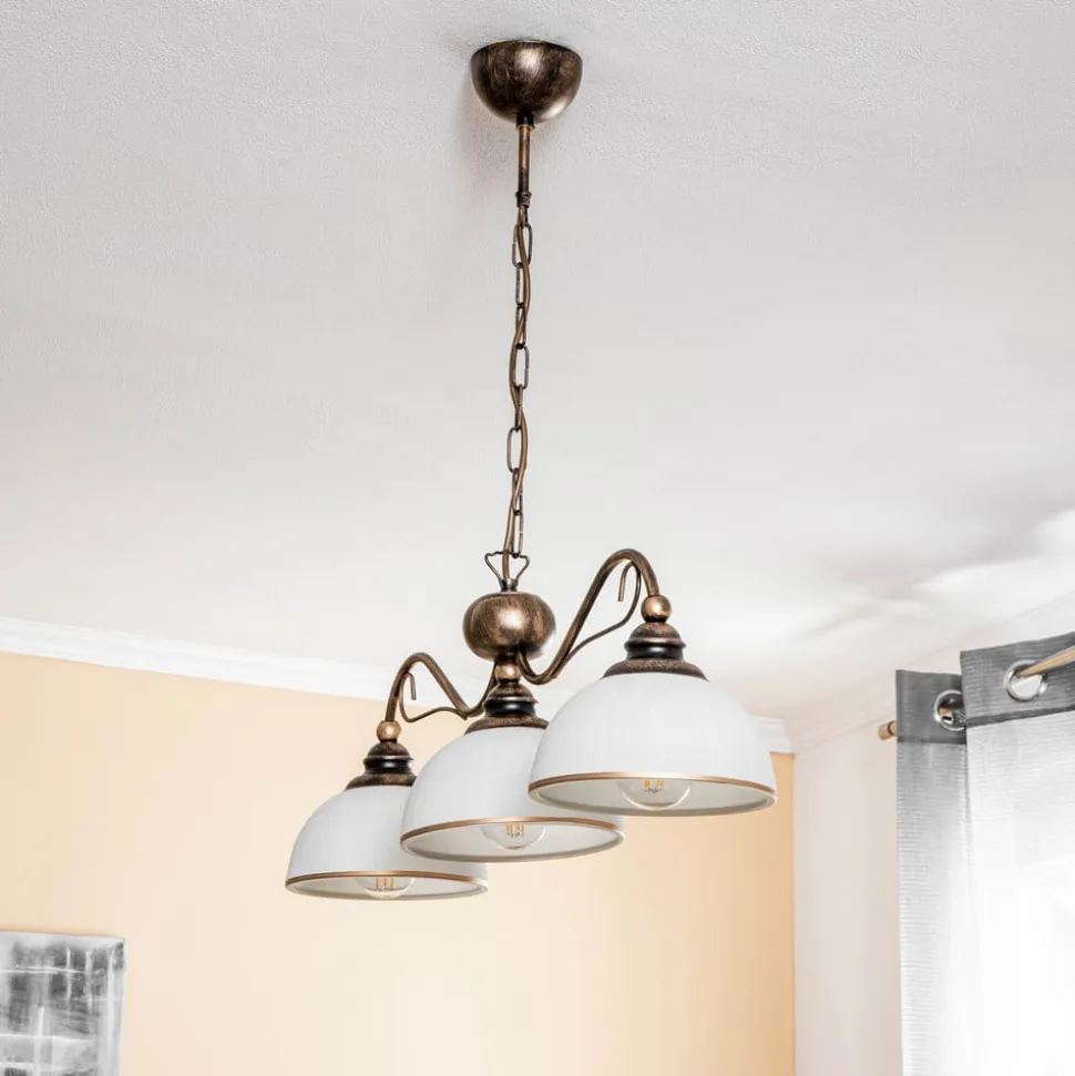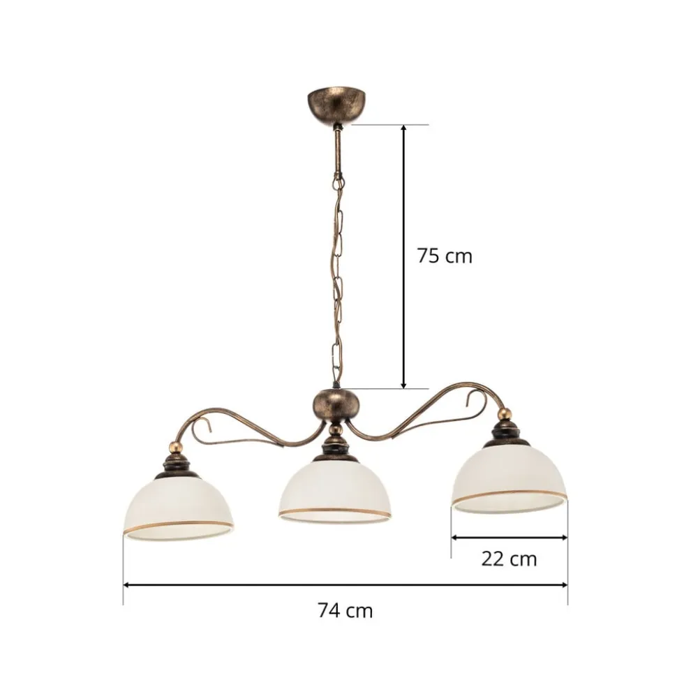 Pendellampen i bjælkeform Casale forener antik charme med moderne funktionalitet og bliver dermed et blikfang i enhver stue og spisestue. Den er fremstillet af højkvalitets metal og glas og imponerer med sin elegante farve i antik messing og hvid. Konstruktionen med 3 lyskilder sikrer en jævn og behagelig belysning, der skaber en hyggelig atmosfære i både stuer, køkkener og spisestuer.