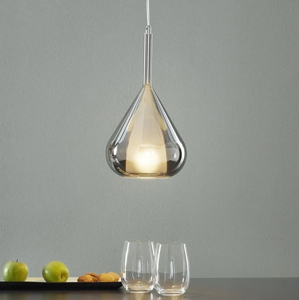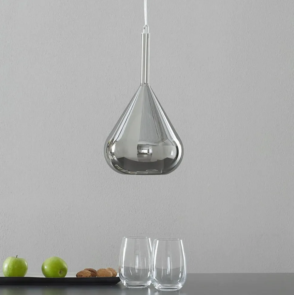 Lila glaspendel i dråbeform med hvid inderskærm Lila-pendlen er en smuk lampe med en dråbeformet glasskærm, der giver den et meget legende og elegant udseende. Den ydre skærm er lavet af borosilikatglas og har en mindre, hvid glasskærm indbygget nedenunder, som direkte omgiver den lyskilde, der skal bruges. Lyset filtreres blidt gennem de to lag glas, hvilket giver både et bord nedenunder og hele rummet en æstetisk effekt og et elegant udseende. Lila hænger i et hvidt, metallisk ophæng og stråler både individuelt og som en del af et arrangement.