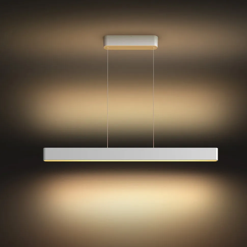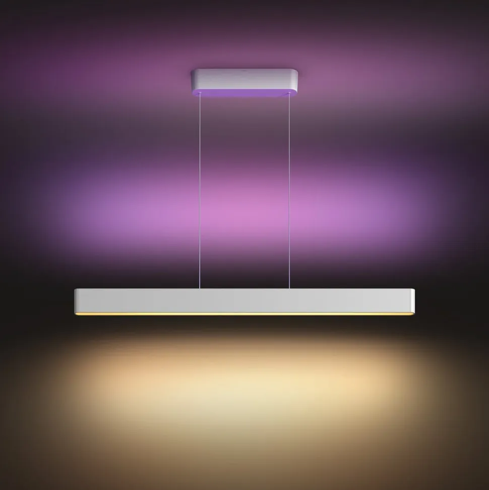 Ensis pendellampen er et absolut højdepunkt inden for alsidig og smart interiørbelysning. Den er udstyret med en opadgående og en nedadgående Hue-stribe i hvid og Color Ambiance-teknologi, som kan styres separat. På den måde opnås f.eks. direkte, hvidt, funktionelt lys og indirekte, farvestrålende rumbelysning på samme tid. Ensis er ideel til brug over borde i stuer og spisestuer.