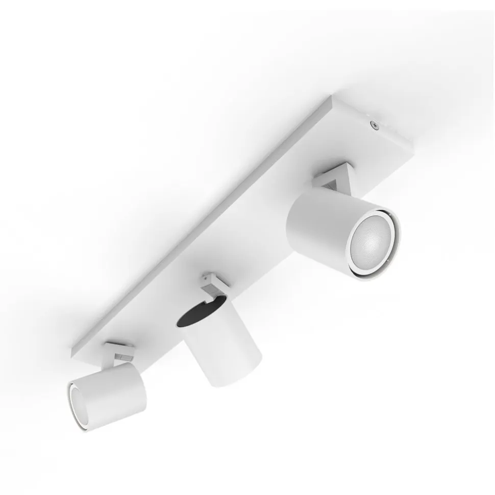 3 lyskilder Philips Hue LED Runner loftspot inkl. lysdæmper til praktisk lysstyring Runner LED-loftspot leveres med tre White Ambiance GU10 LED-lyskilder og en mobil lysdæmper. Armaturets ramme er lavet af robust metal. Den ret smalle metalstrimmel, som kan monteres både i loftet og på væggen, er udstyret med tre drejelige og svingbare spotlights, som kan tilpasses individuelt til rummets situation. Takket være den indbyggede ZigBee-standard kan lyset integreres i et eksisterende Hue-system, så lyset også nemt kan styres via mobiltelefon, tablet eller en kompatibel stemmeassistent. Alternativt kan lyset også styres med den medfølgende lysdæmper, som også fungerer uden at være tilsluttet et smart home-system, og som leveres med fire forskellige lysopskrifter. Afhængigt af humør eller tidspunkt på dagen kan lyset ikke kun dæmmes, men lystemperaturen (fra varmhvid til dagslys) kan også justeres individuelt, så lysbilledet til enhver tid kan tilpasses brugerens situation eller ønsker.